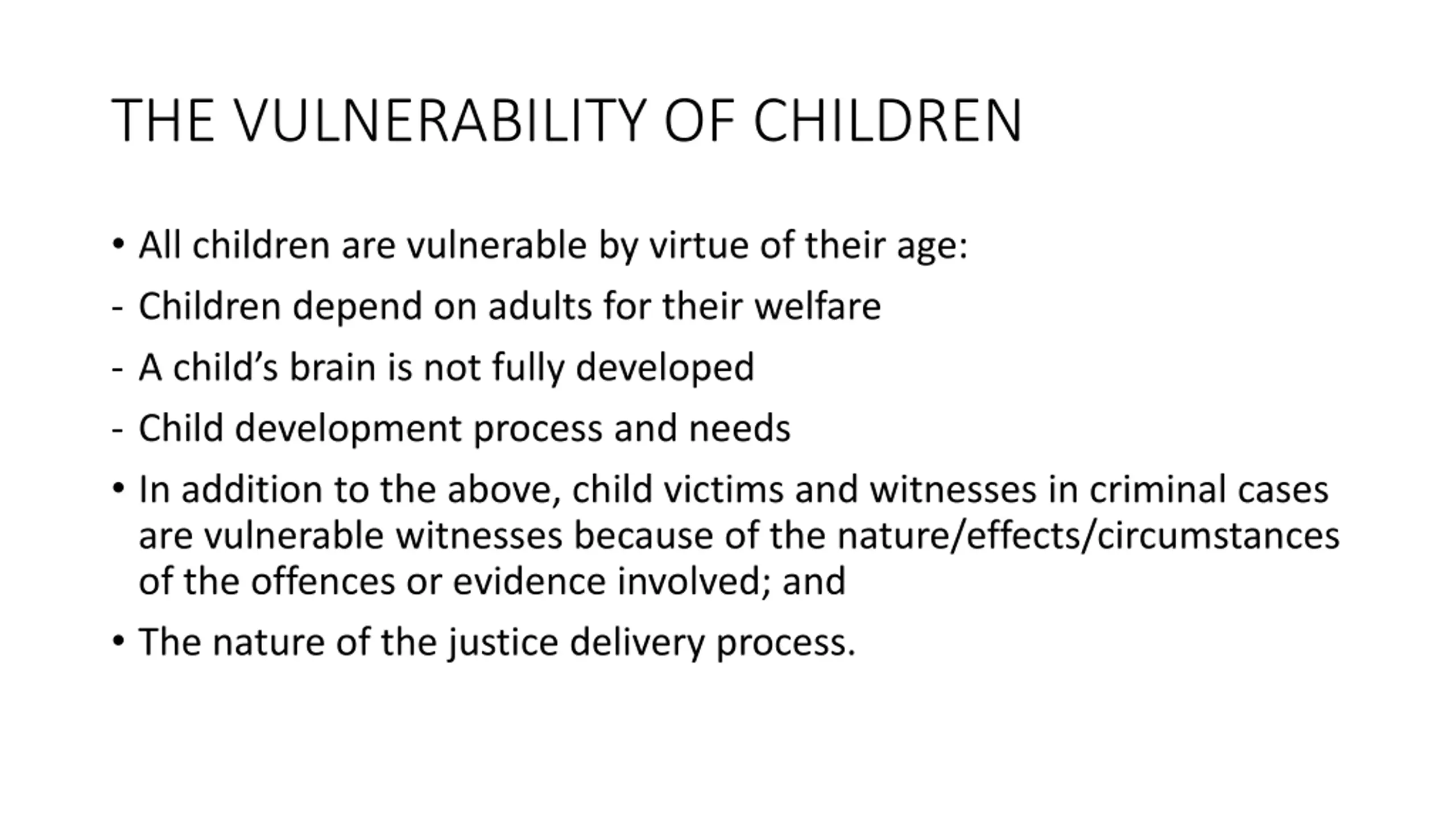 THE VULNERABILITY OF CHILDREN All children are vulnerable by virtue of their age: - Children depend on adults for their welfare - A child s brain is not fully developed - Child development process and needs In addition to the above, child victims and witnesses in criminal cases are vulnerable witnesses because of the nature/effects/circumstances of the offences or evidence involved; and The nature of the justice delivery process.