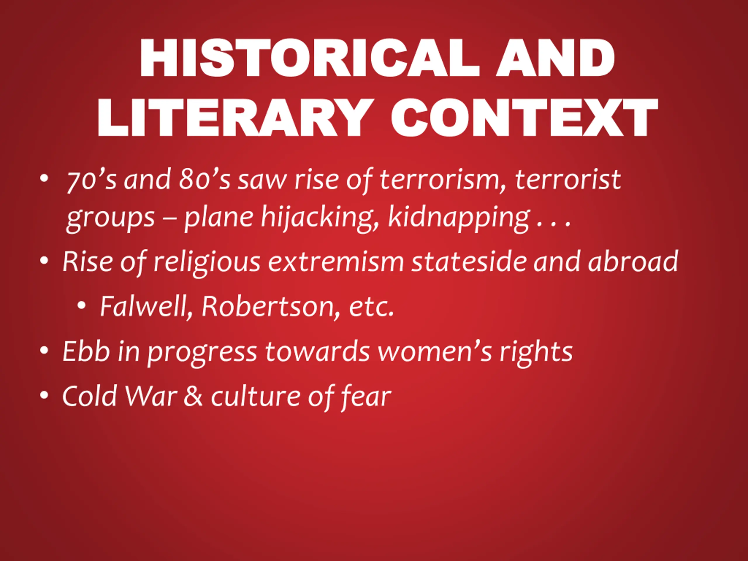 HISTORICAL AND HISTORICAL AND LITERARY CONTEXT LITERARY CONTEXT 70 s and 80 s saw rise of terrorism, terrorist groups plane hijacking, kidnapping . . . Rise of religious extremism stateside and abroad Falwell, Robertson, etc. Ebb in progress towards women s rights Cold War & culture of fear