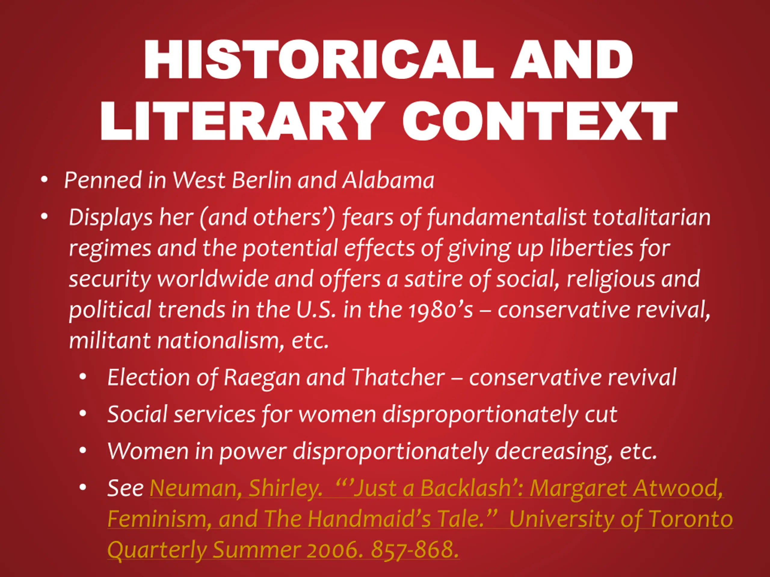 HISTORICAL AND HISTORICAL AND LITERARY CONTEXT LITERARY CONTEXT Penned in West Berlin and Alabama Displays her (and others ) fears of fundamentalist totalitarian regimes and the potential effects of giving up liberties for security worldwide and offers a satire of social, religious and political trends in the U.S. in the 1980 s conservative revival, militant nationalism, etc. Election of Raegan and Thatcher conservative revival Social services for women disproportionately cut Women in power disproportionately decreasing, etc. See Neuman, Shirley. Just a Backlash : Margaret Atwood, Feminism, and The Handmaid s Tale. University of Toronto Quarterly Summer 2006. 857-868.
