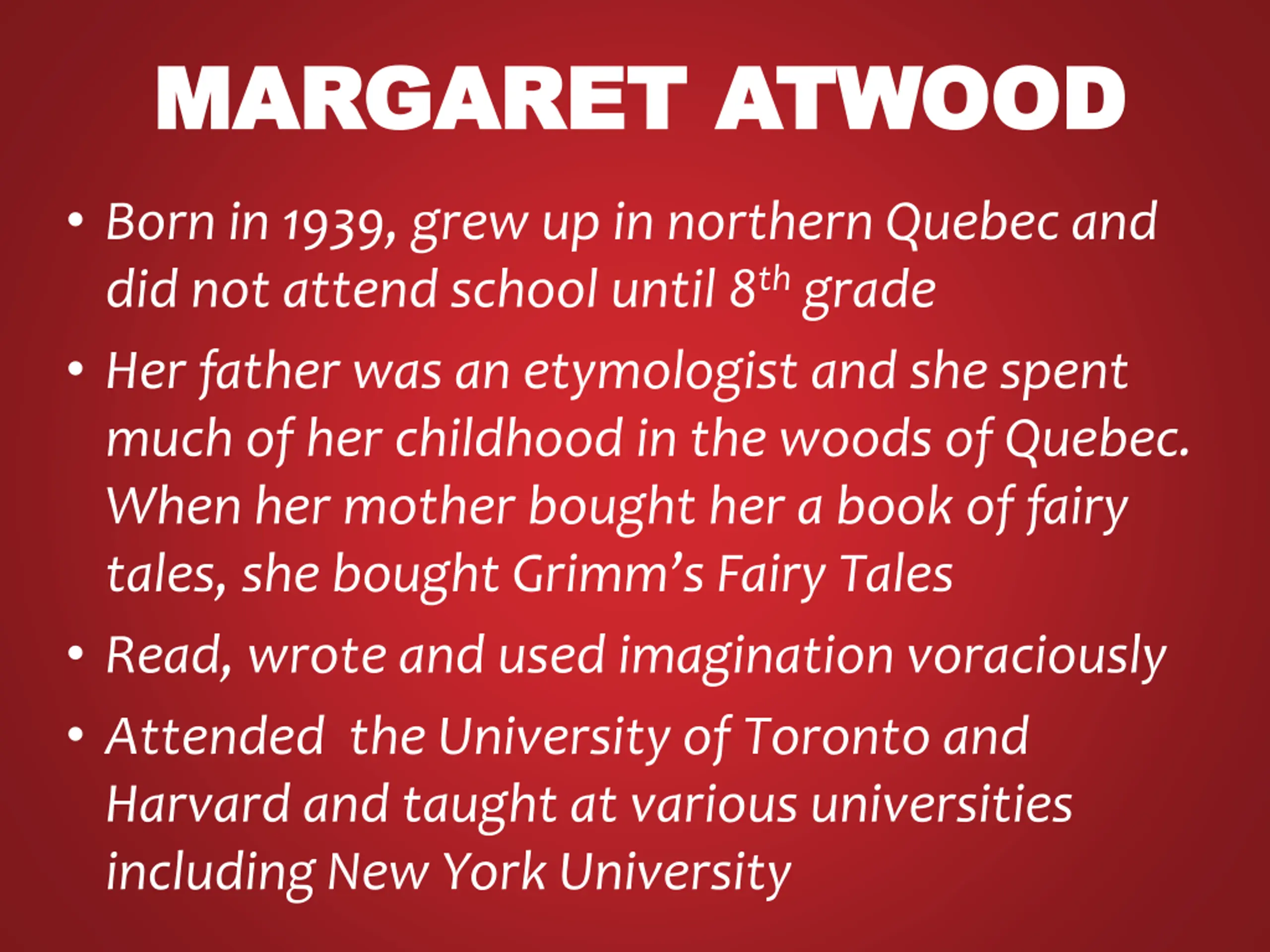 MARGARET ATWOOD MARGARET ATWOOD Born in 1939, grew up in northern Quebec and did not attend school until 8thgrade Her father was an etymologist and she spent much of her childhood in the woods of Quebec. When her mother bought her a book of fairy tales, she bought Grimm s Fairy Tales Read, wrote and used imagination voraciously Attended the University of Toronto and Harvard and taught at various universities including New York University