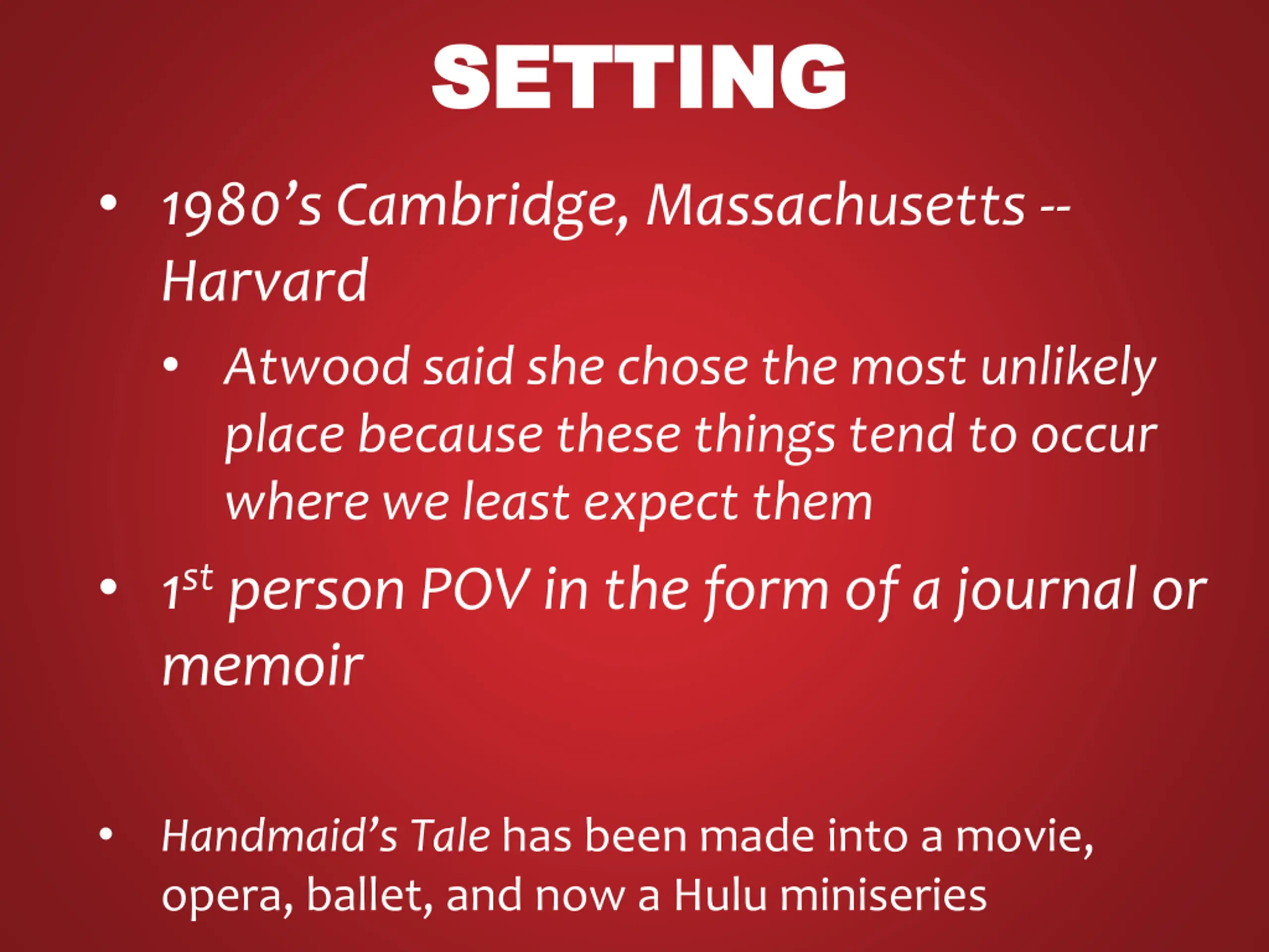 SETTING SETTING 1980 s Cambridge, Massachusetts -- Harvard Atwood said she chose the most unlikely place because these things tend to occur where we least expect them 1stperson POV in the form of a journal or memoir Handmaid s Tale has been made into a movie, opera, ballet, and now a Hulu miniseries