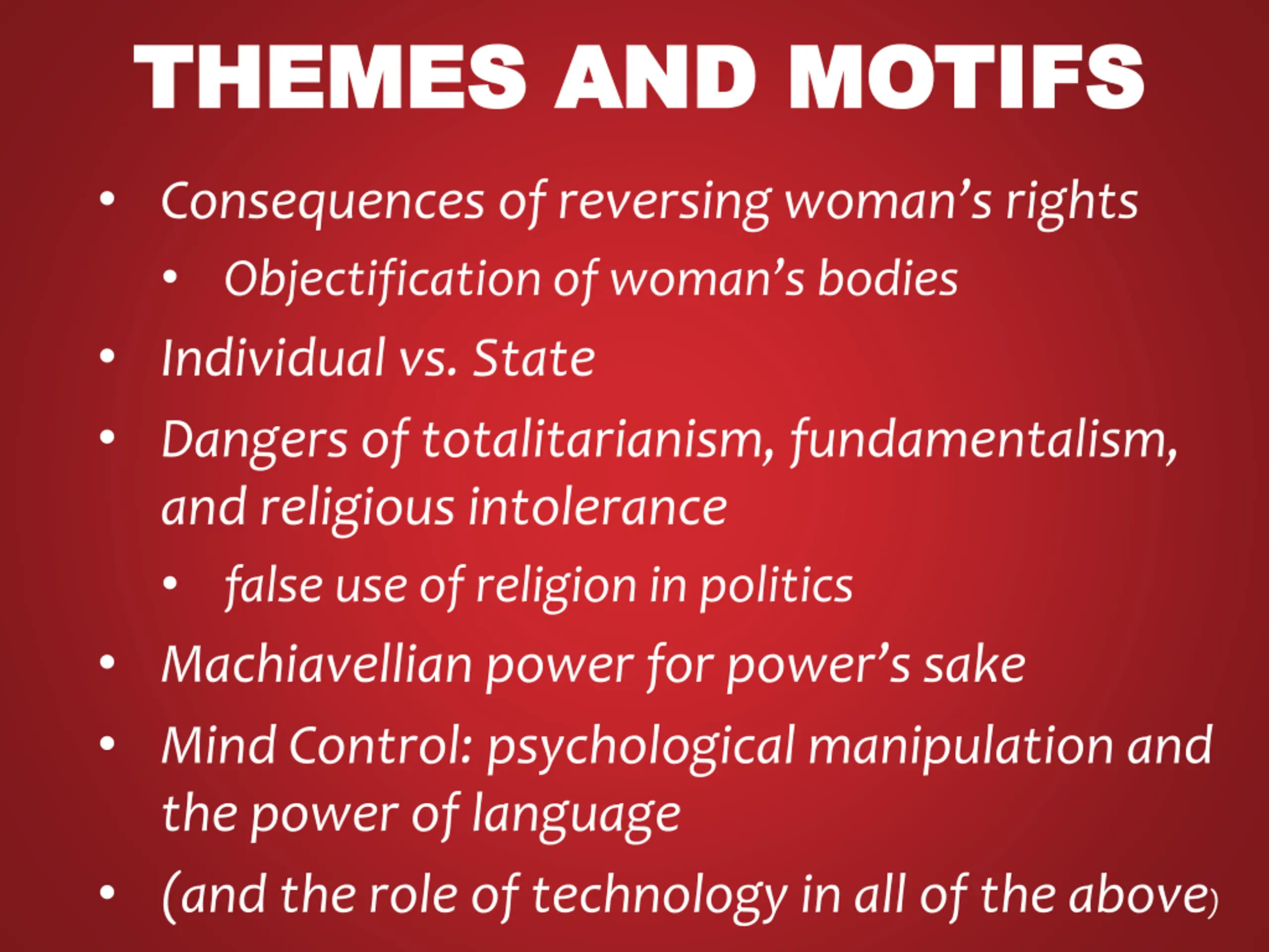THEMES AND MOTIFS THEMES AND MOTIFS Consequences of reversing woman s rights Objectification of woman s bodies Individual vs. State Dangers of totalitarianism, fundamentalism, and religious intolerance false use of religion in politics Machiavellian power for power s sake Mind Control: psychological manipulation and the power of language (and the role of technology in all of the above)