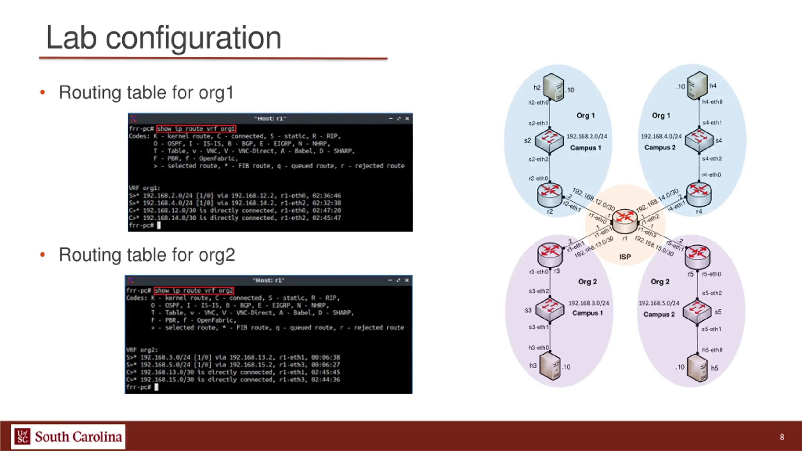 Lab configuration Routing table for org1 h4 .10 h2 .10 h2 h4-eth0 h2-eth0 Org 1 Org 1 s4-eth1 s2-eth1 192.168.2.0/24 192.168.4.0/24 Campus 2 s4 s2 s2 Campus 1 s4-eth2 s2-eth2 r4-eth0 r2-eth0 r2 r4 r1 Routing table for org2 ISP r3 r3-eth0 r5 r5-eth0 Org 2 Org 2 s3-eth2 s5-eth2 192.168.3.0/24 Campus 1 192.168.5.0/24 s2 s3 s2 s5 Campus 2 s3-eth1 s5-eth1 h3-eth0 h5-eth0 h3 .10 .10 h5 8