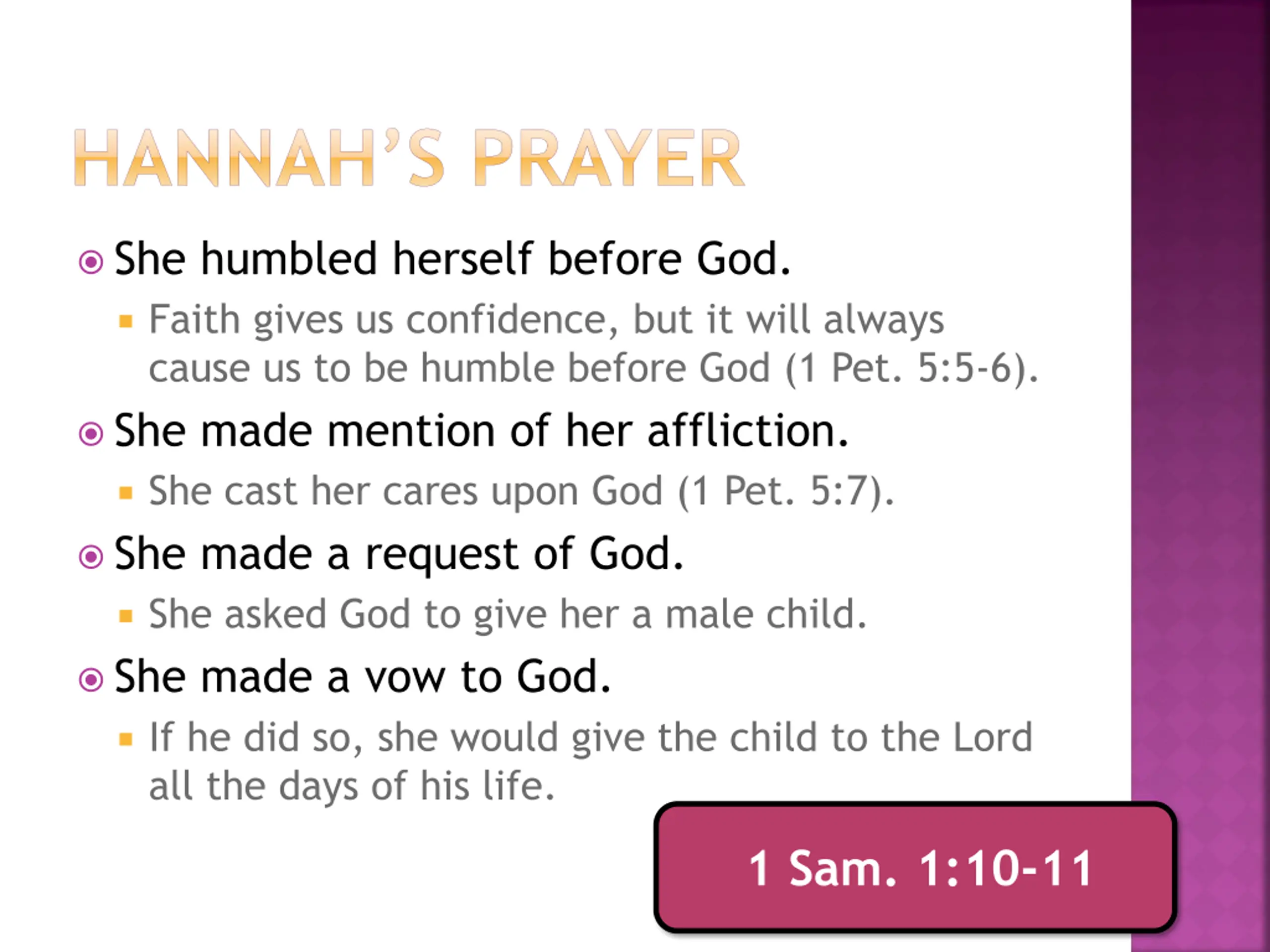 HANNAHS PRAYER She humbled herself before God. Faith gives us confidence, but it will always cause us to be humble before God (1 Pet. 5:5-6). She made mention of her affliction. She cast her cares upon God (1 Pet. 5:7). She made a request of God. She asked God to give her a male child. She made a vow to God. If he did so, she would give the child to the Lord all the days of his life. 1 Sam. 1:10-11