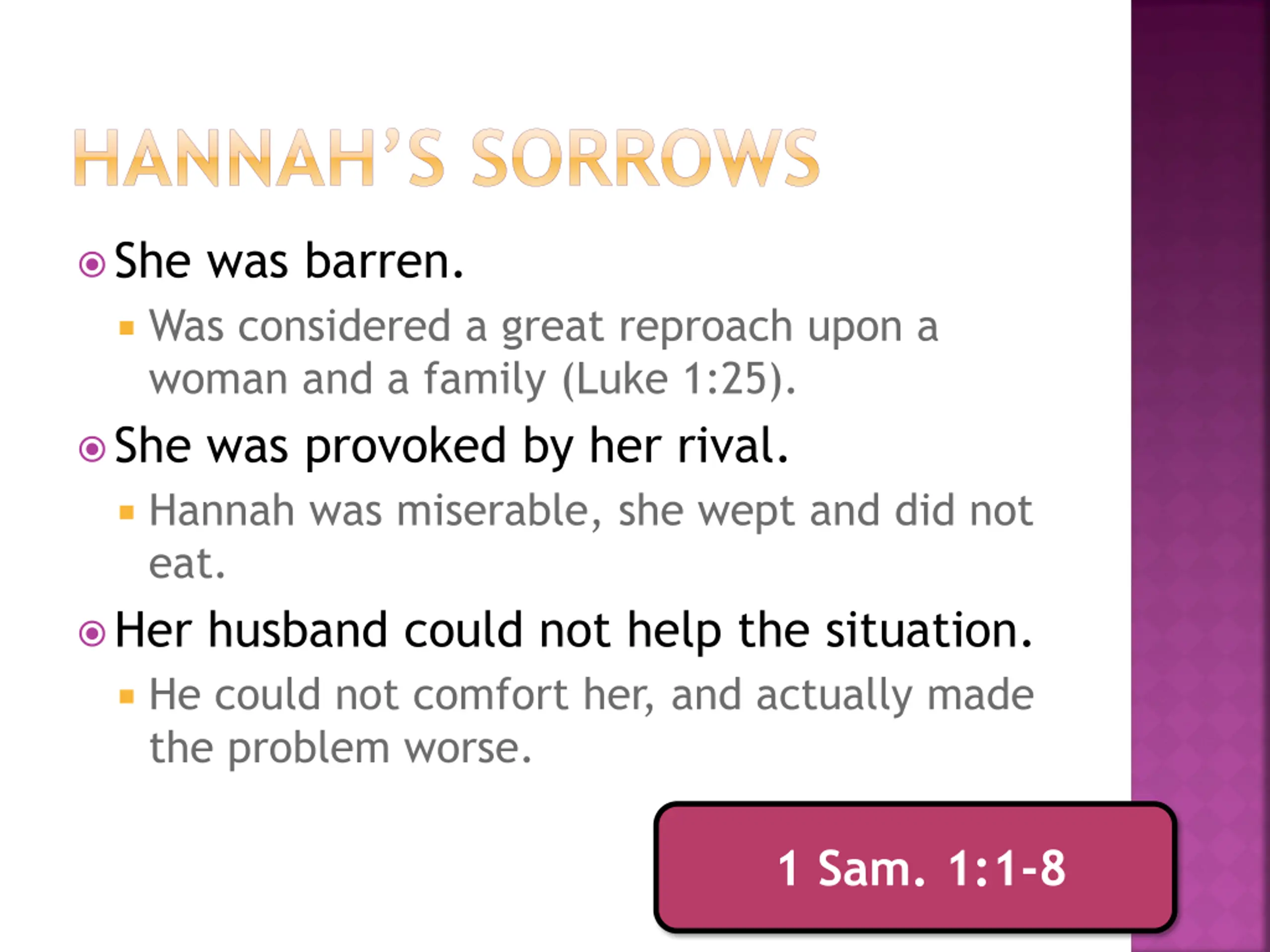 HANNAHS SORROWS She was barren. Was considered a great reproach upon a woman and a family (Luke 1:25). She was provoked by her rival. Hannah was miserable, she wept and did not eat. Her husband could not help the situation. He could not comfort her, and actually made the problem worse. 1 Sam. 1:1-8