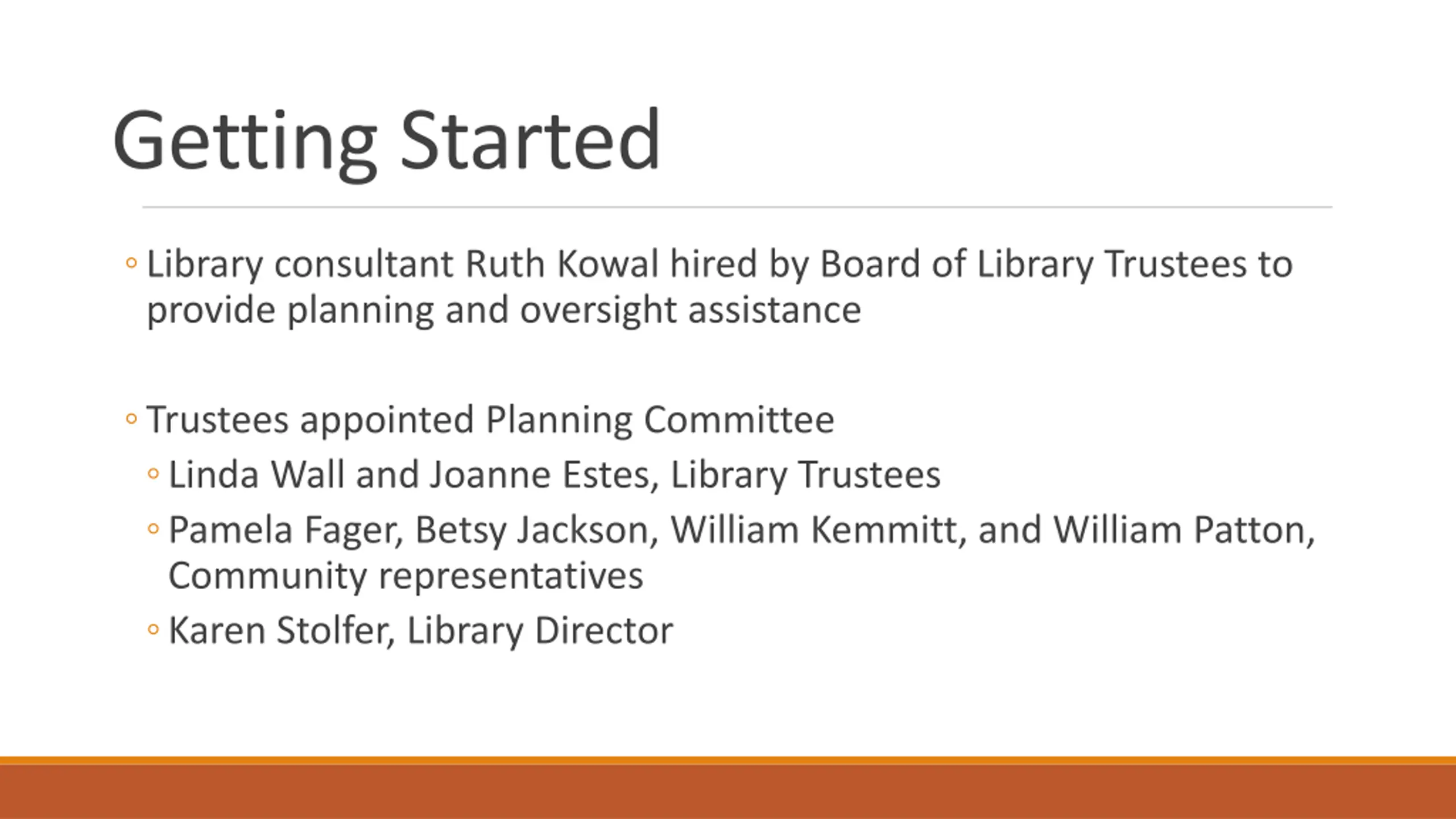 Getting Started Library consultant Ruth Kowal hired by Board of Library Trustees to provide planning and oversight assistance Trustees appointed Planning Committee Linda Wall and Joanne Estes, Library Trustees Pamela Fager, Betsy Jackson, William Kemmitt, and William Patton, Community representatives Karen Stolfer, Library Director