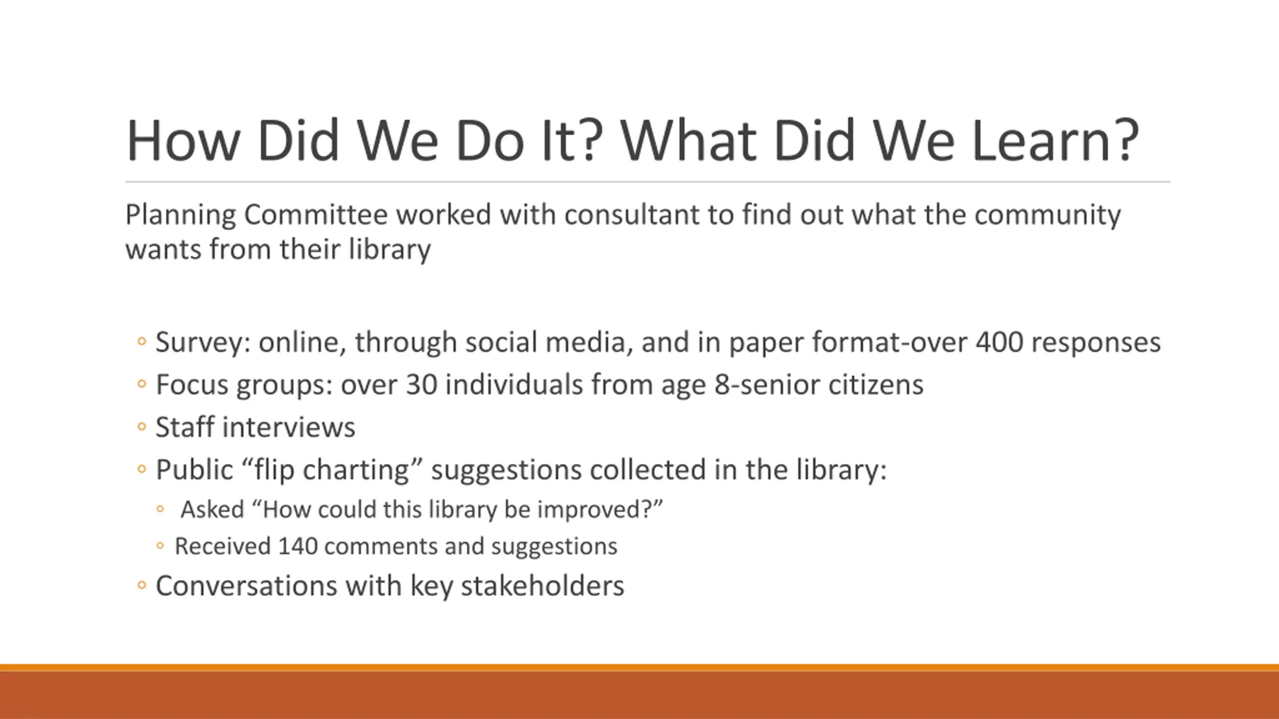How Did We Do It? What Did We Learn? Planning Committee worked with consultant to find out what the community wants from their library Survey: online, through social media, and in paper format-over 400 responses Focus groups: over 30 individuals from age 8-senior citizens Staff interviews Public flip charting suggestions collected in the library: Asked How could this library be improved? Received 140 comments and suggestions Conversations with key stakeholders