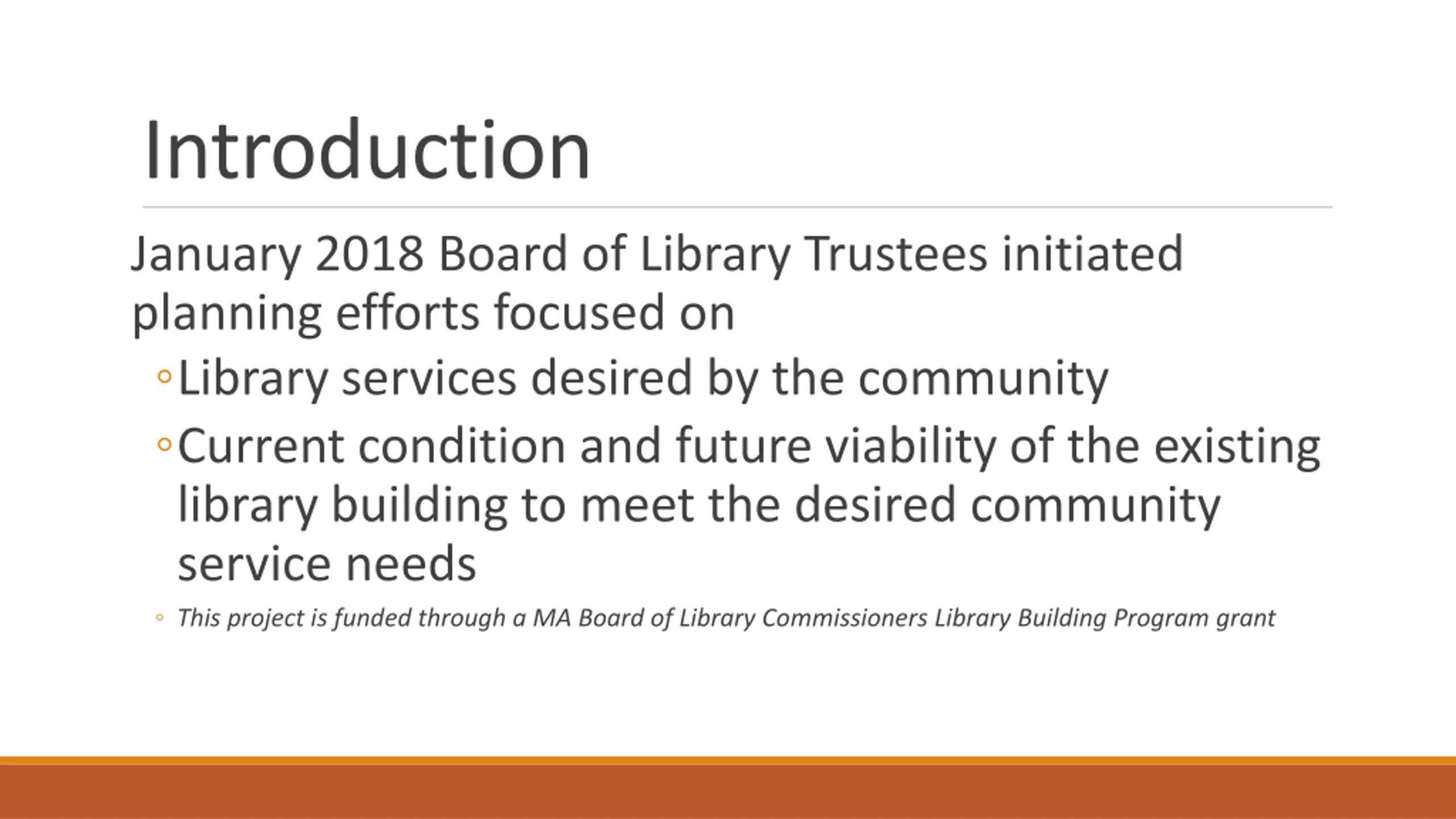 Introduction January 2018 Board of Library Trustees initiated planning efforts focused on Library services desired by the community Current condition and future viability of the existing library building to meet the desired community service needs This project is funded through a MA Board of Library Commissioners Library Building Program grant