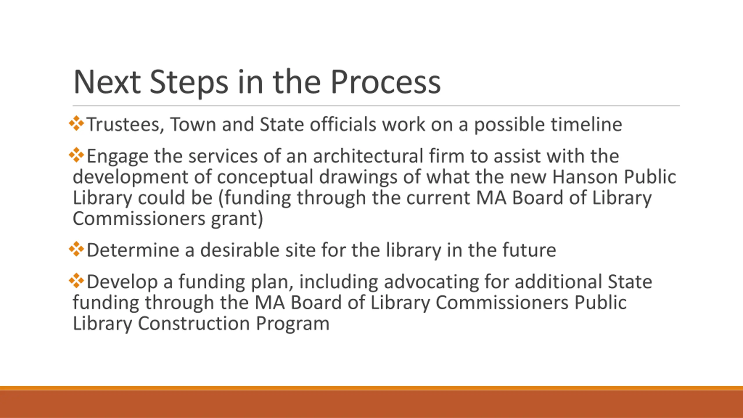 Next Steps in the Process Trustees, Town and State officials work on a possible timeline Engage the services of an architectural firm to assist with the development of conceptual drawings of what the new Hanson Public Library could be (funding through the current MA Board of Library Commissioners grant) Determine a desirable site for the library in the future Develop a funding plan, including advocating for additional State funding through the MA Board of Library Commissioners Public Library Construction Program