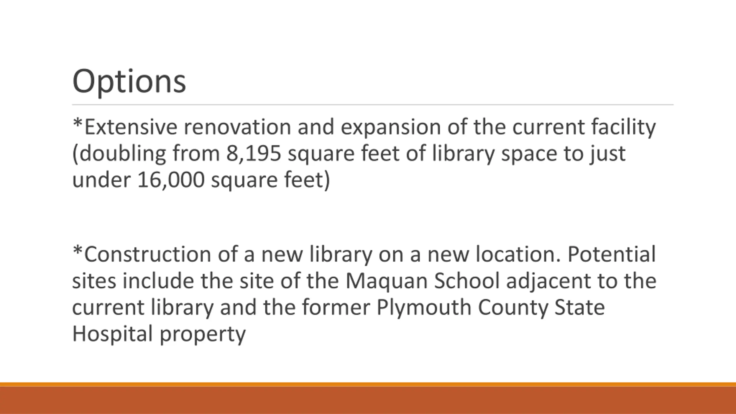 Options *Extensive renovation and expansion of the current facility (doubling from 8,195 square feet of library space to just under 16,000 square feet) *Construction of a new library on a new location. Potential sites include the site of the Maquan School adjacent to the current library and the former Plymouth County State Hospital property
