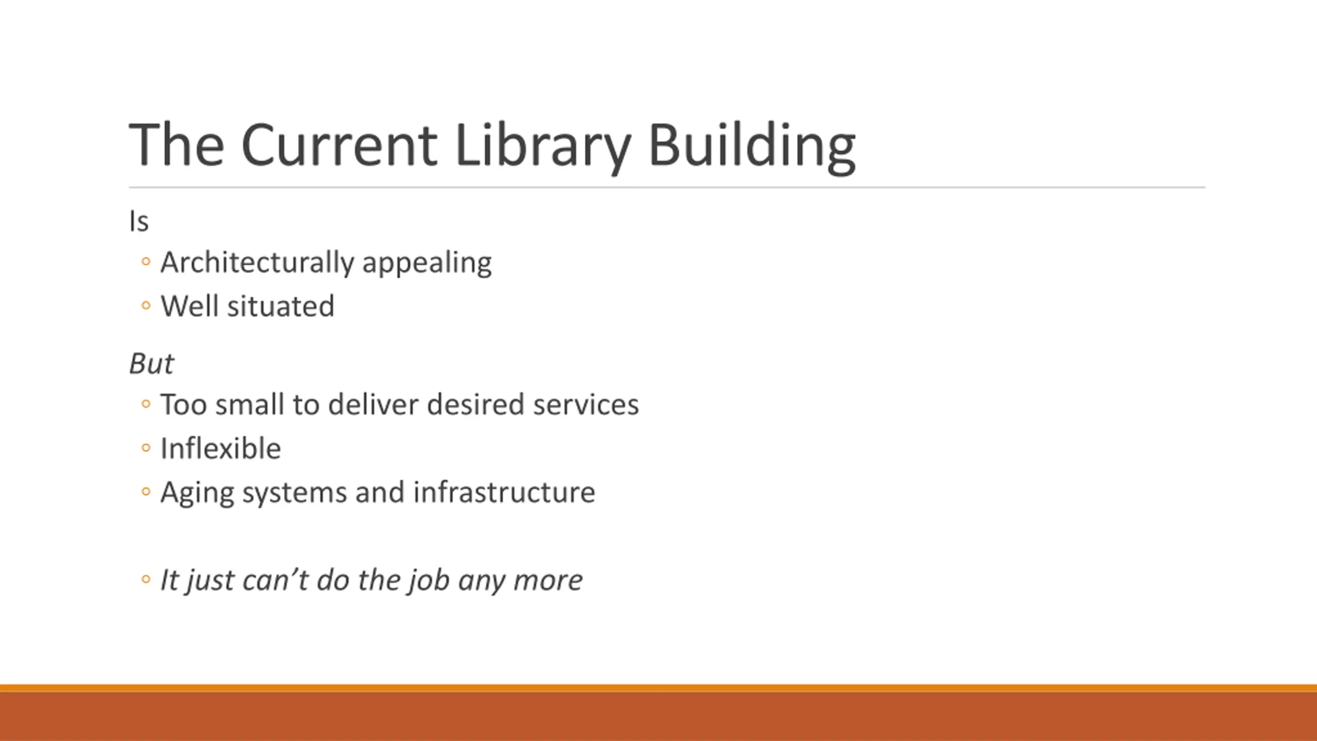 The Current Library Building Is Architecturally appealing Well situated But Too small to deliver desired services Inflexible Aging systems and infrastructure It just can t do the job any more