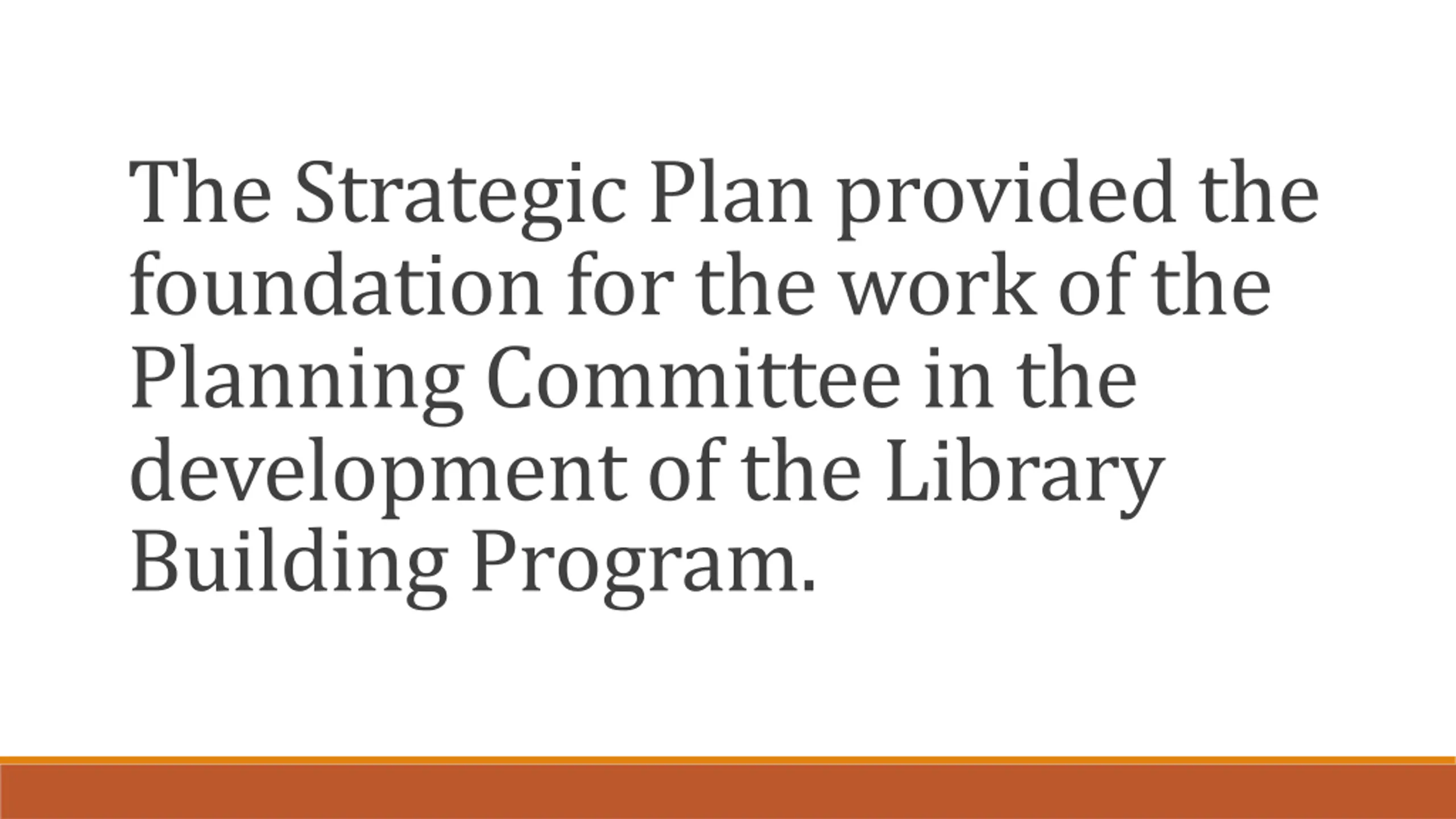 The Strategic Plan provided the foundation for the work of the Planning Committee in the development of the Library Building Program.