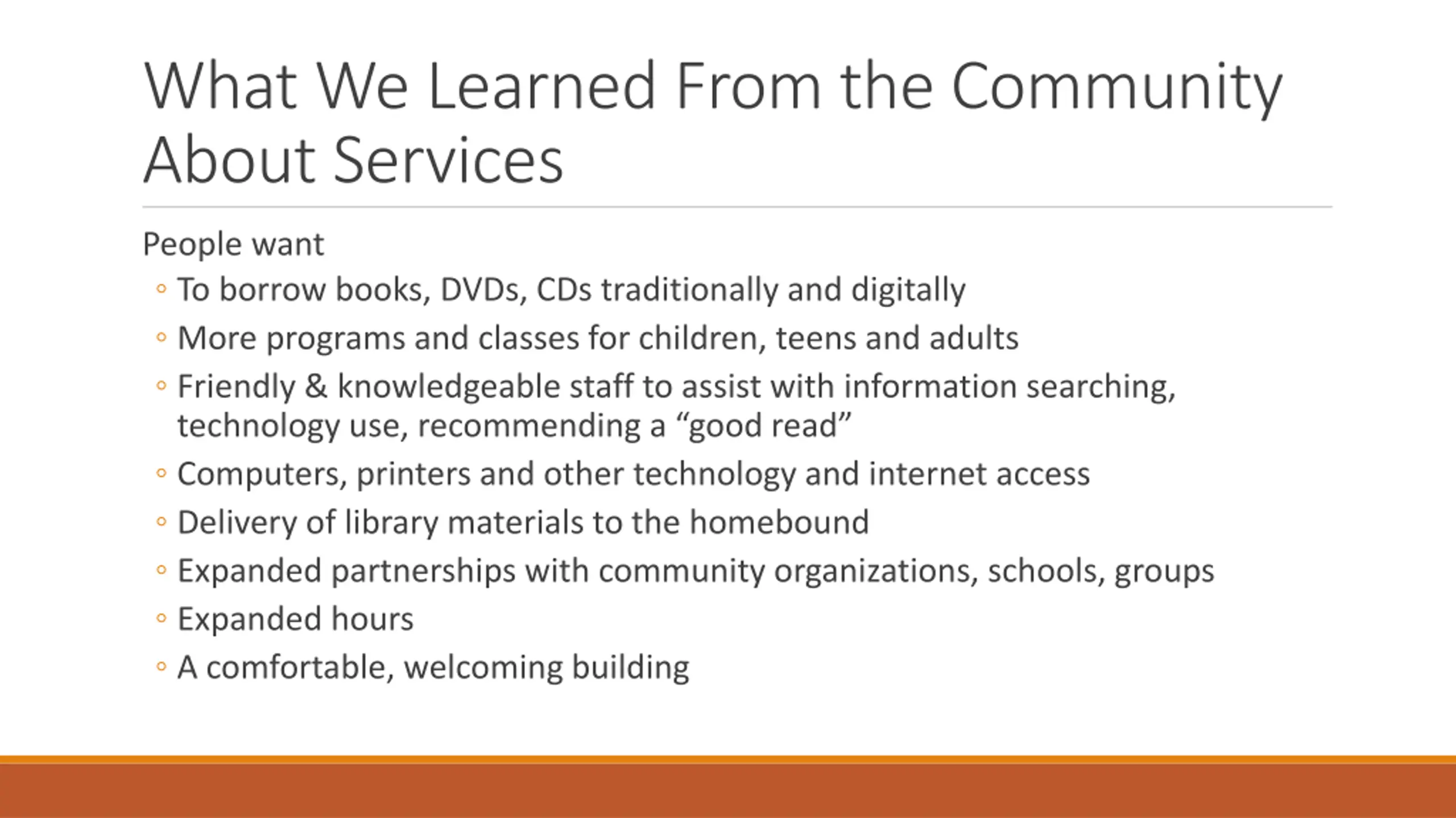 What We Learned From the Community About Services People want To borrow books, DVDs, CDs traditionally and digitally More programs and classes for children, teens and adults Friendly & knowledgeable staff to assist with information searching, technology use, recommending a good read Computers, printers and other technology and internet access Delivery of library materials to the homebound Expanded partnerships with community organizations, schools, groups Expanded hours A comfortable, welcoming building