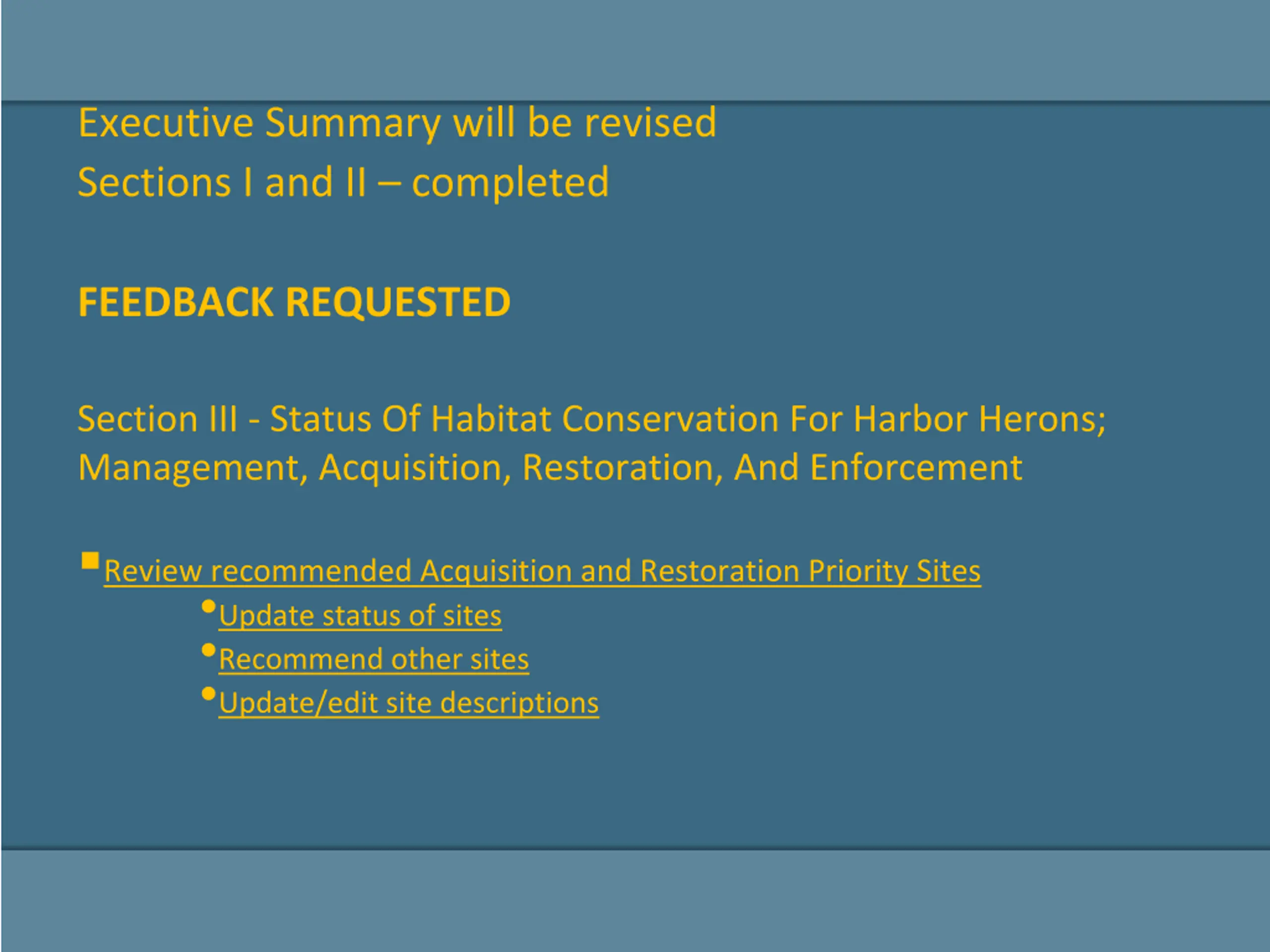 Executive Summary will be revised Sections I and II completed FEEDBACK REQUESTED Section III - Status Of Habitat Conservation For Harbor Herons; Management, Acquisition, Restoration, And Enforcement Review recommended Acquisition and Restoration Priority Sites Update status of sites Recommend other sites Update/edit site descriptions