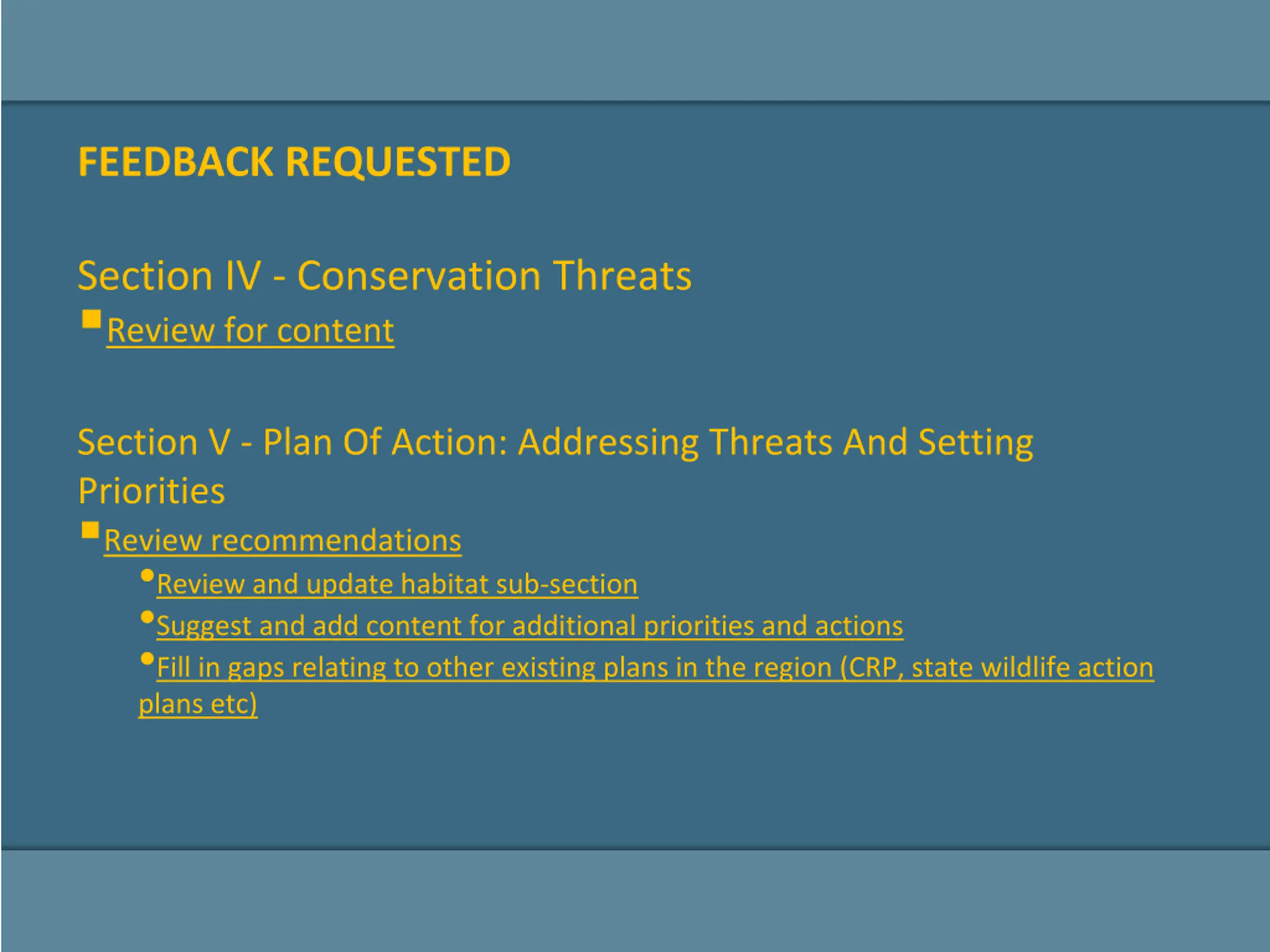 FEEDBACK REQUESTED Section IV - Conservation Threats Review for content Section V - Plan Of Action: Addressing Threats And Setting Priorities Review recommendations Review and update habitat sub-section Suggest and add content for additional priorities and actions Fill in gaps relating to other existing plans in the region (CRP, state wildlife action plans etc)
