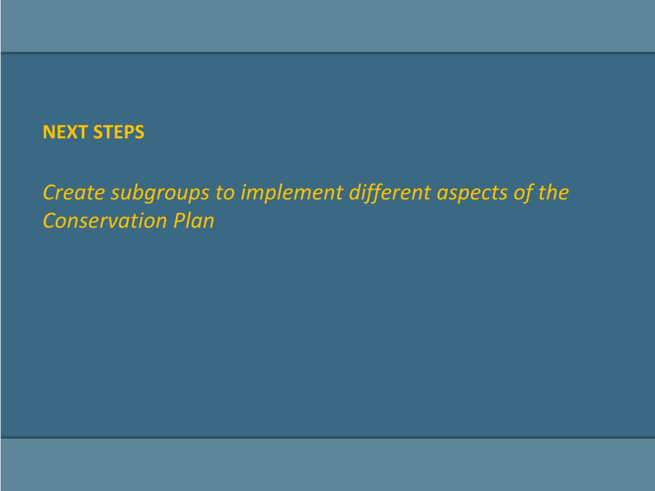 NEXT STEPS Create subgroups to implement different aspects of the Conservation Plan