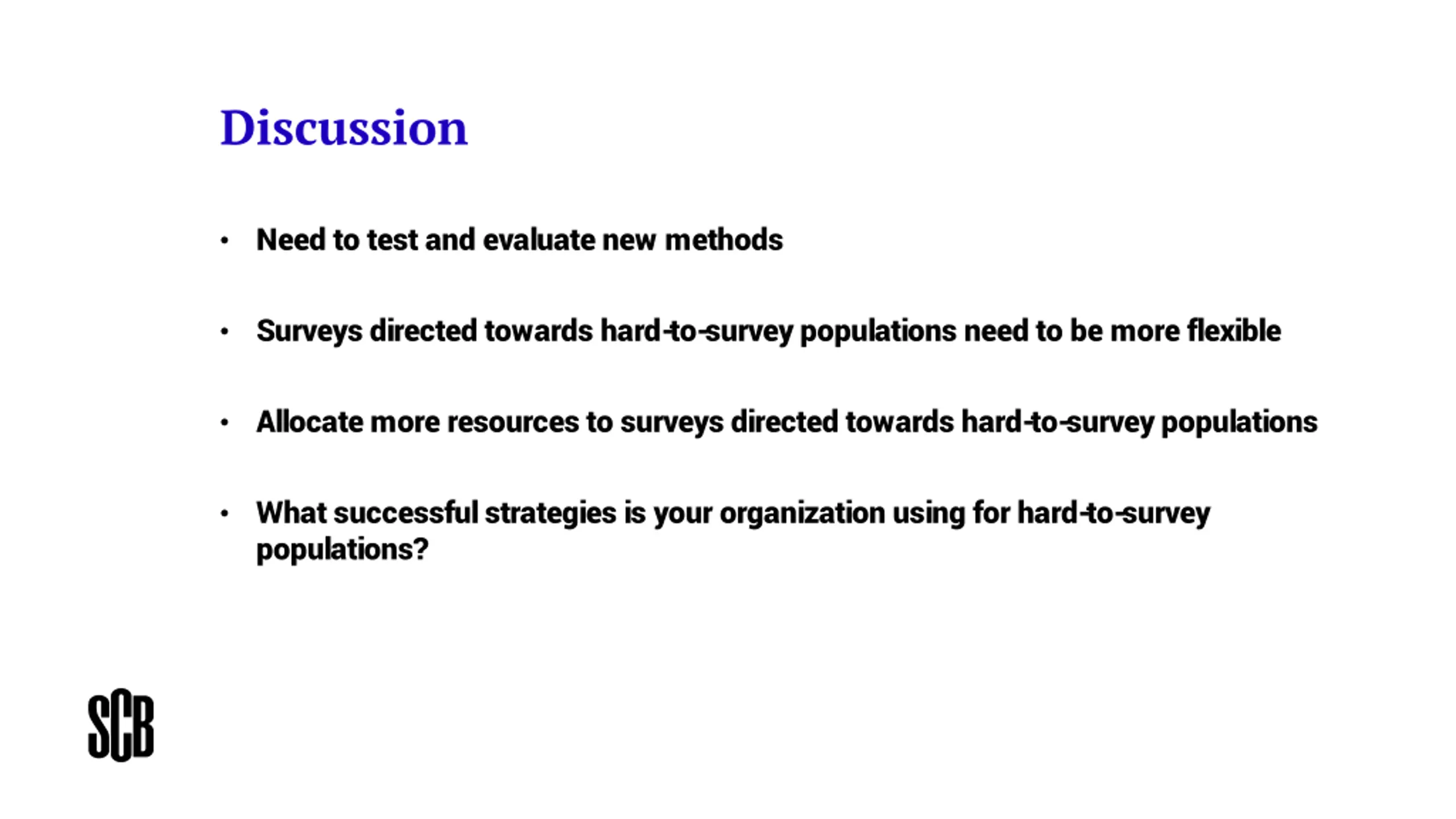 Discussion Need to test and evaluate new methods Surveys directed towards hard-to-survey populations need to be more flexible Allocate more resources to surveys directed towards hard-to-survey populations What successful strategies is your organization using for hard-to-survey populations?