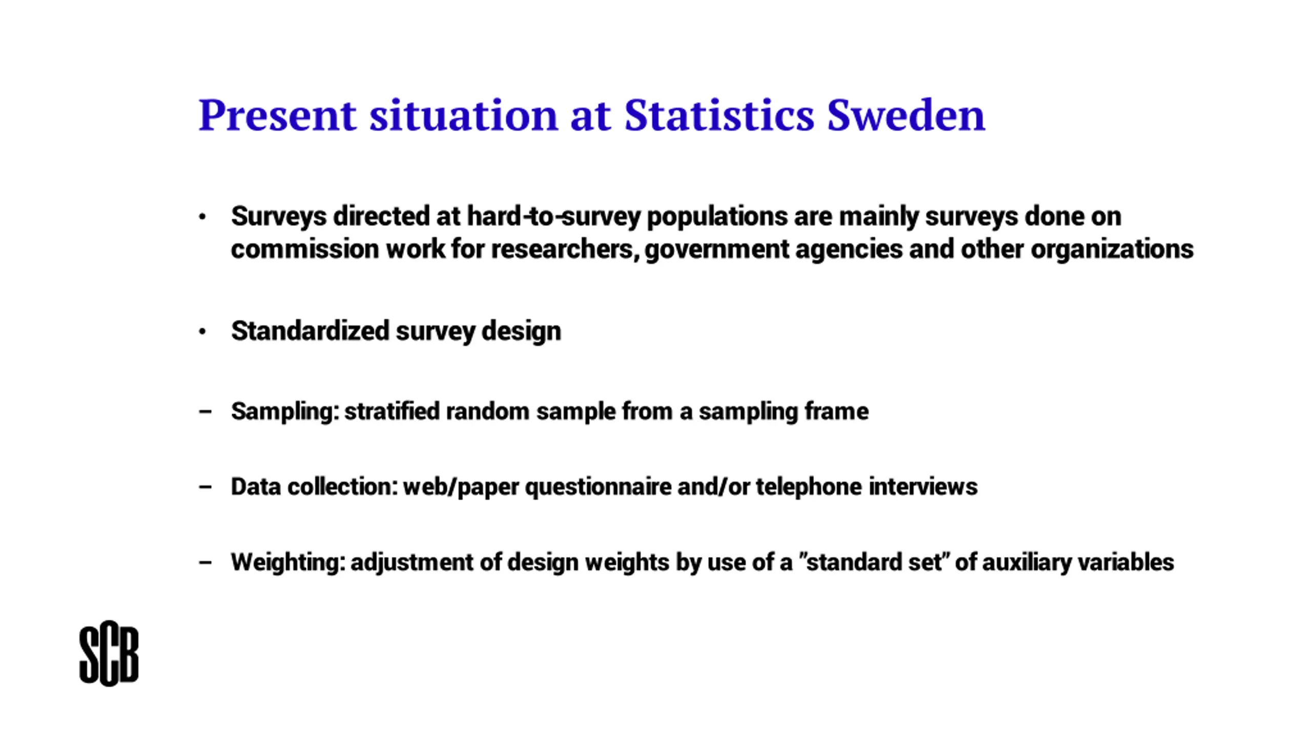 Present situation at Statistics Sweden Surveys directed at hard-to-survey populations are mainly surveys done on commission work for researchers, government agencies and other organizations Standardized survey design Sampling: stratified random sample from a sampling frame Data collection: web/paper questionnaire and/or telephone interviews Weighting: adjustment of design weights by use of a standard set of auxiliary variables