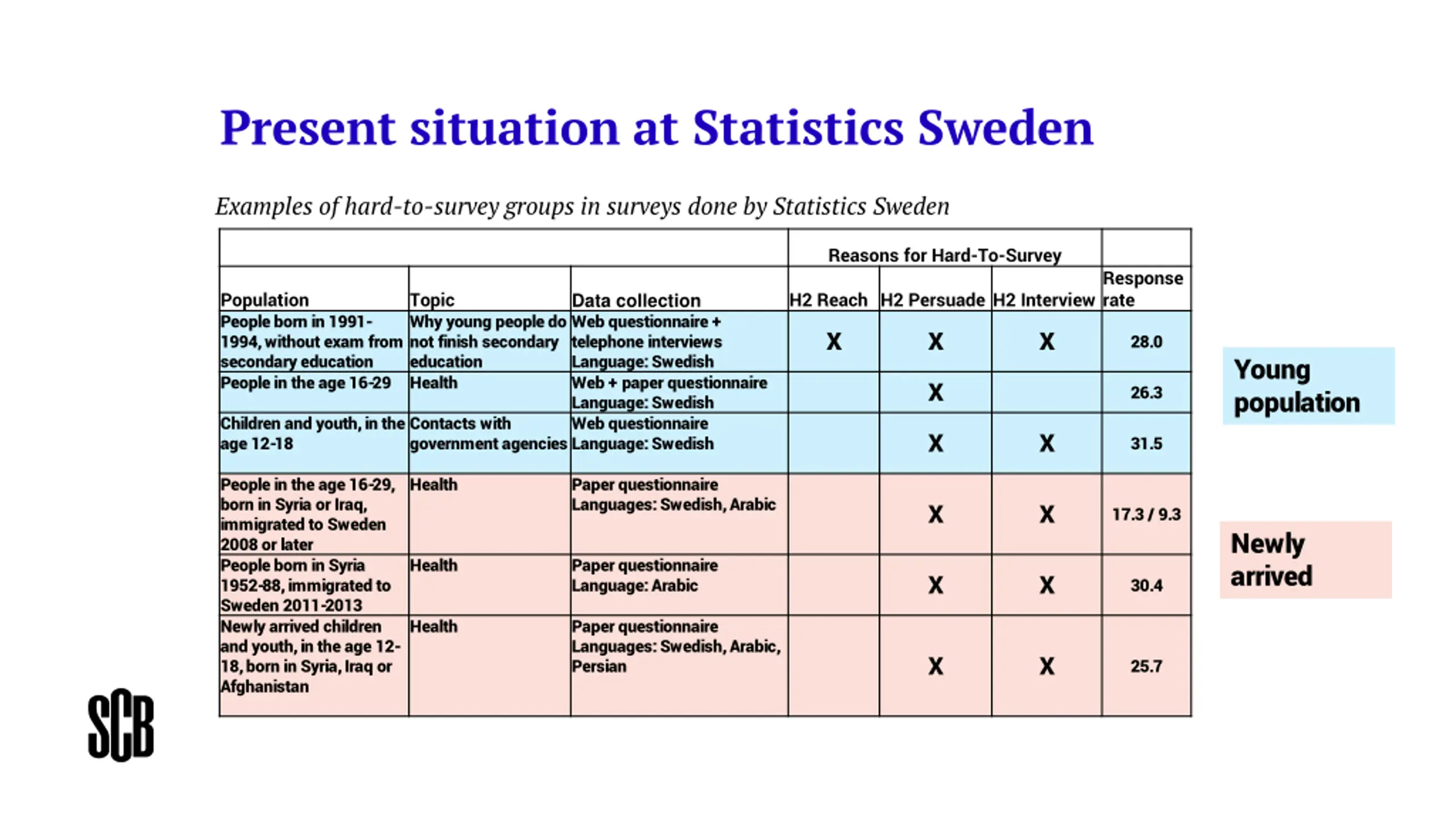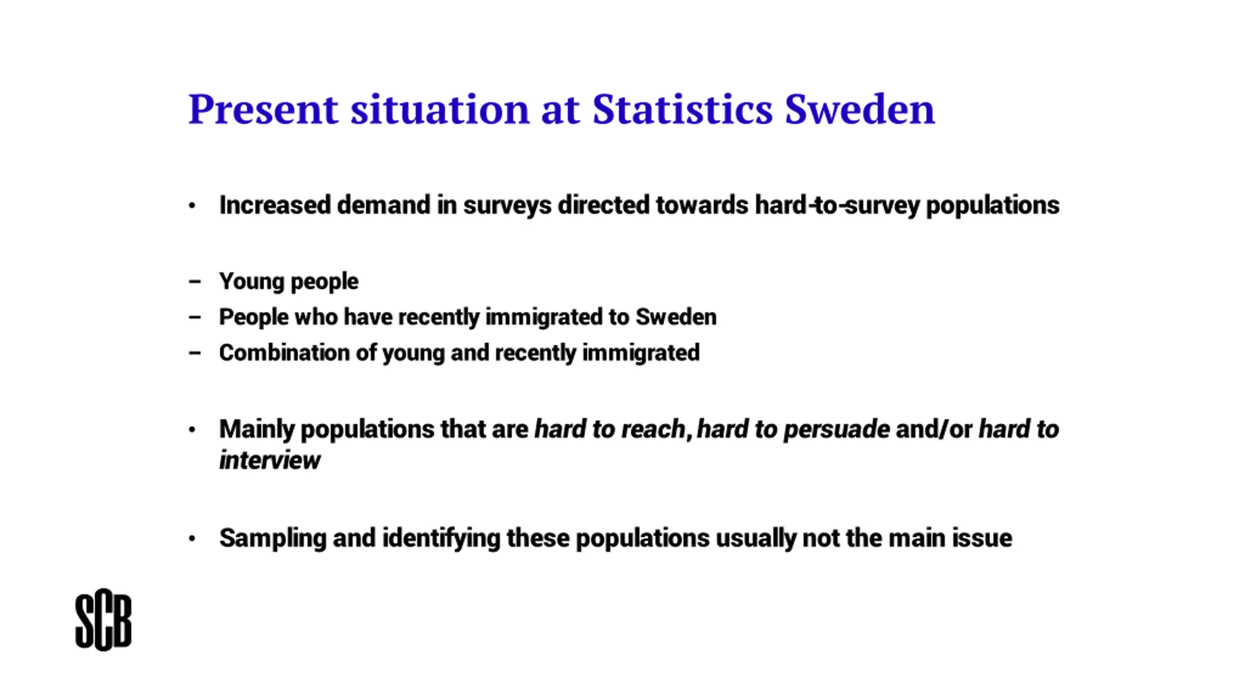 Present situation at Statistics Sweden Increased demand in surveys directed towards hard-to-survey populations Young people People who have recently immigrated to Sweden Combination of young and recently immigrated Mainly populations that are hard to reach, hard to persuade and/or hard to interview Sampling and identifying these populations usually not the main issue