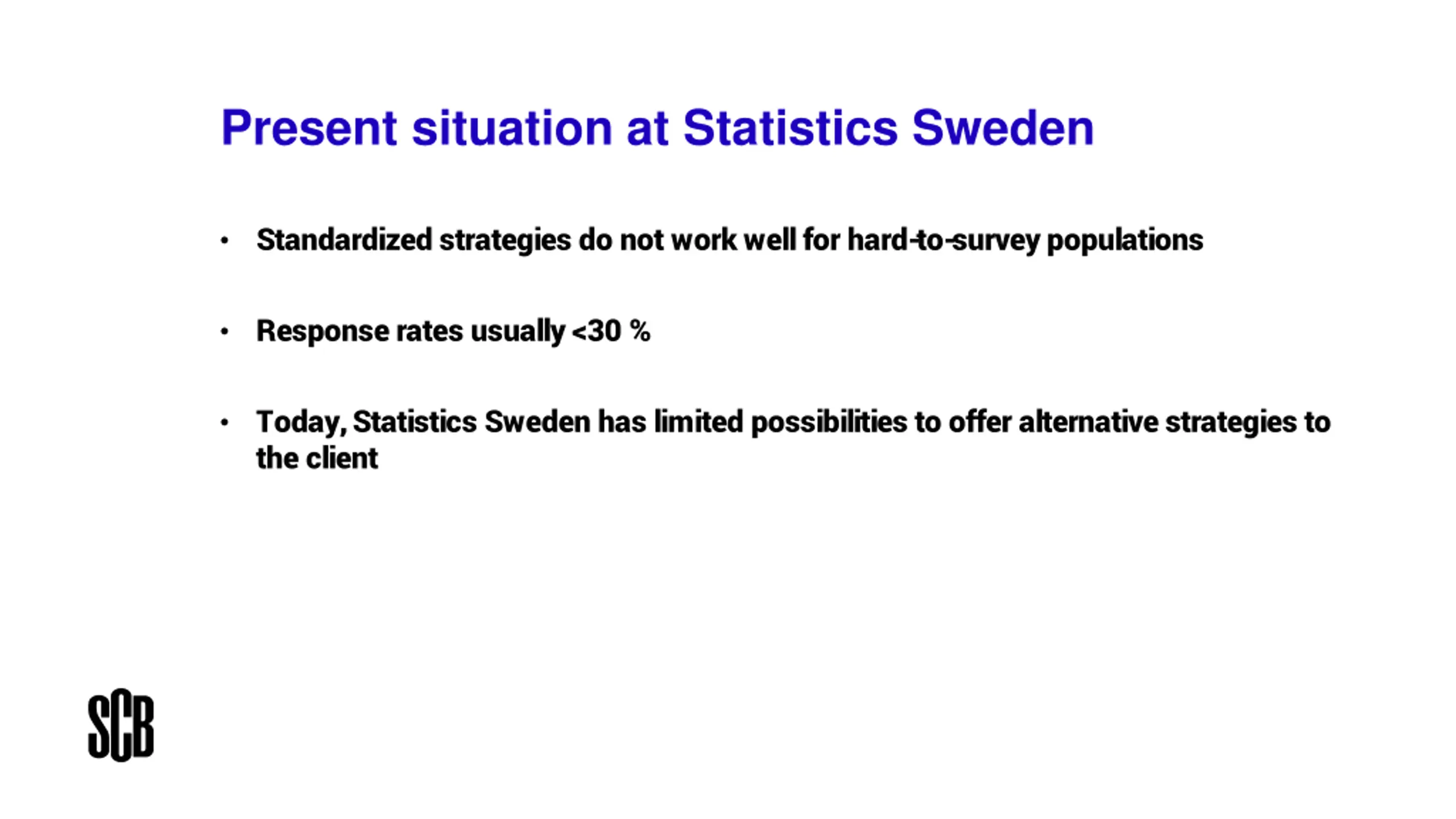 Present situation at Statistics Sweden Standardized strategies do not work well for hard-to-survey populations Response rates usually <30 % Today, Statistics Sweden has limited possibilities to offer alternative strategies to the client