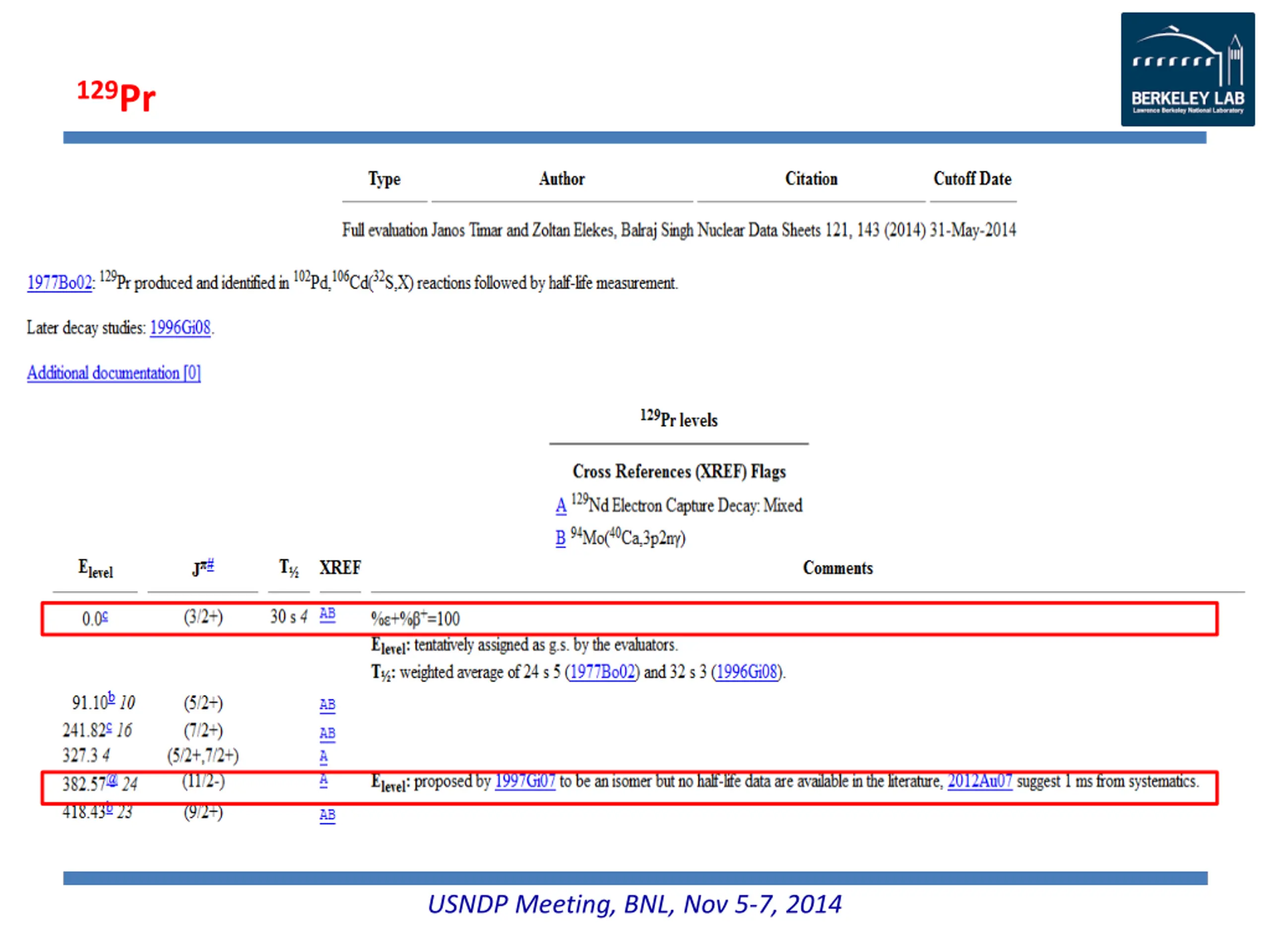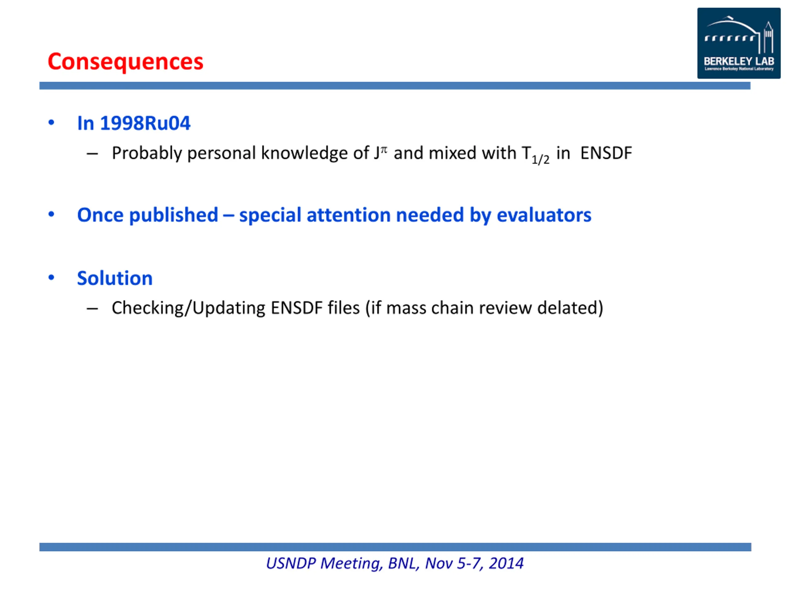 Consequences In 1998Ru04 Probably personal knowledge of J and mixed with T1/2 in ENSDF Once published special attention needed by evaluators Solution Checking/Updating ENSDF files (if mass chain review delated) USNDP Meeting, BNL, Nov 5-7, 2014