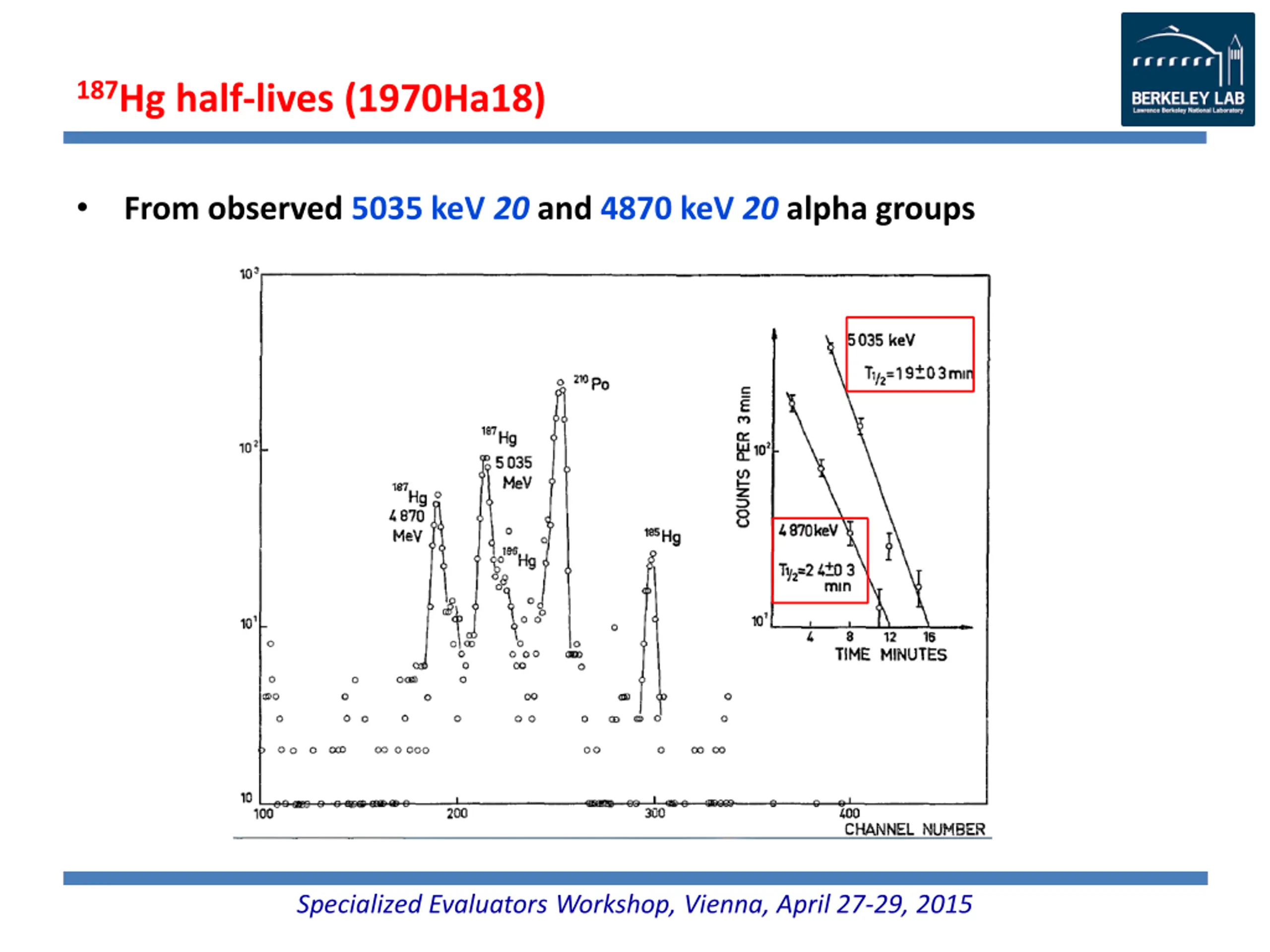 187Hg half-lives (1970Ha18) From observed 5035 keV 20 and 4870 keV 20 alpha groups Specialized Evaluators Workshop, Vienna, April 27-29, 2015