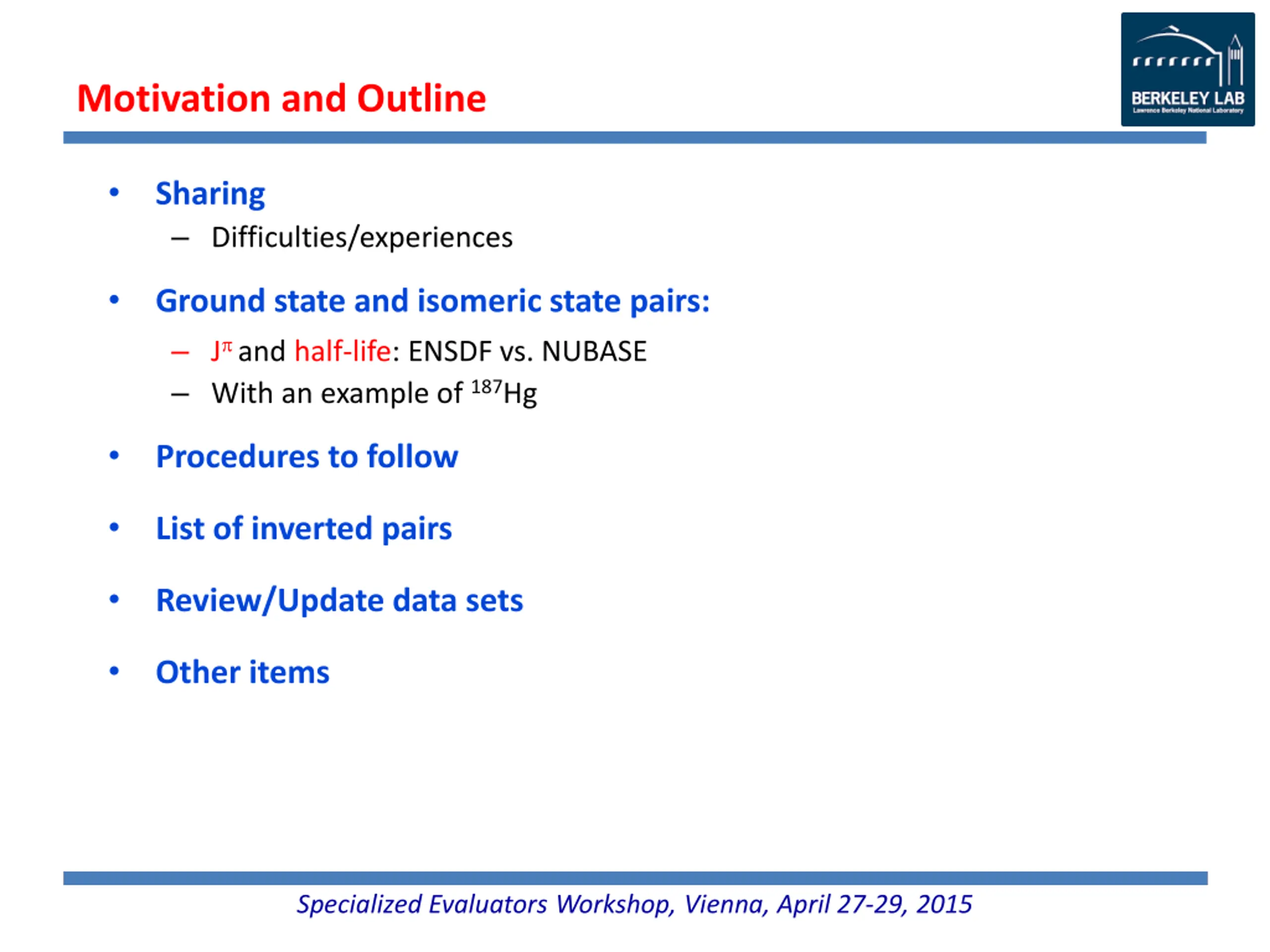 Motivation and Outline Sharing Difficulties/experiences Ground state and isomeric state pairs: J and half-life: ENSDF vs. NUBASE With an example of 187Hg Procedures to follow List of inverted pairs Review/Update data sets Other items Specialized Evaluators Workshop, Vienna, April 27-29, 2015