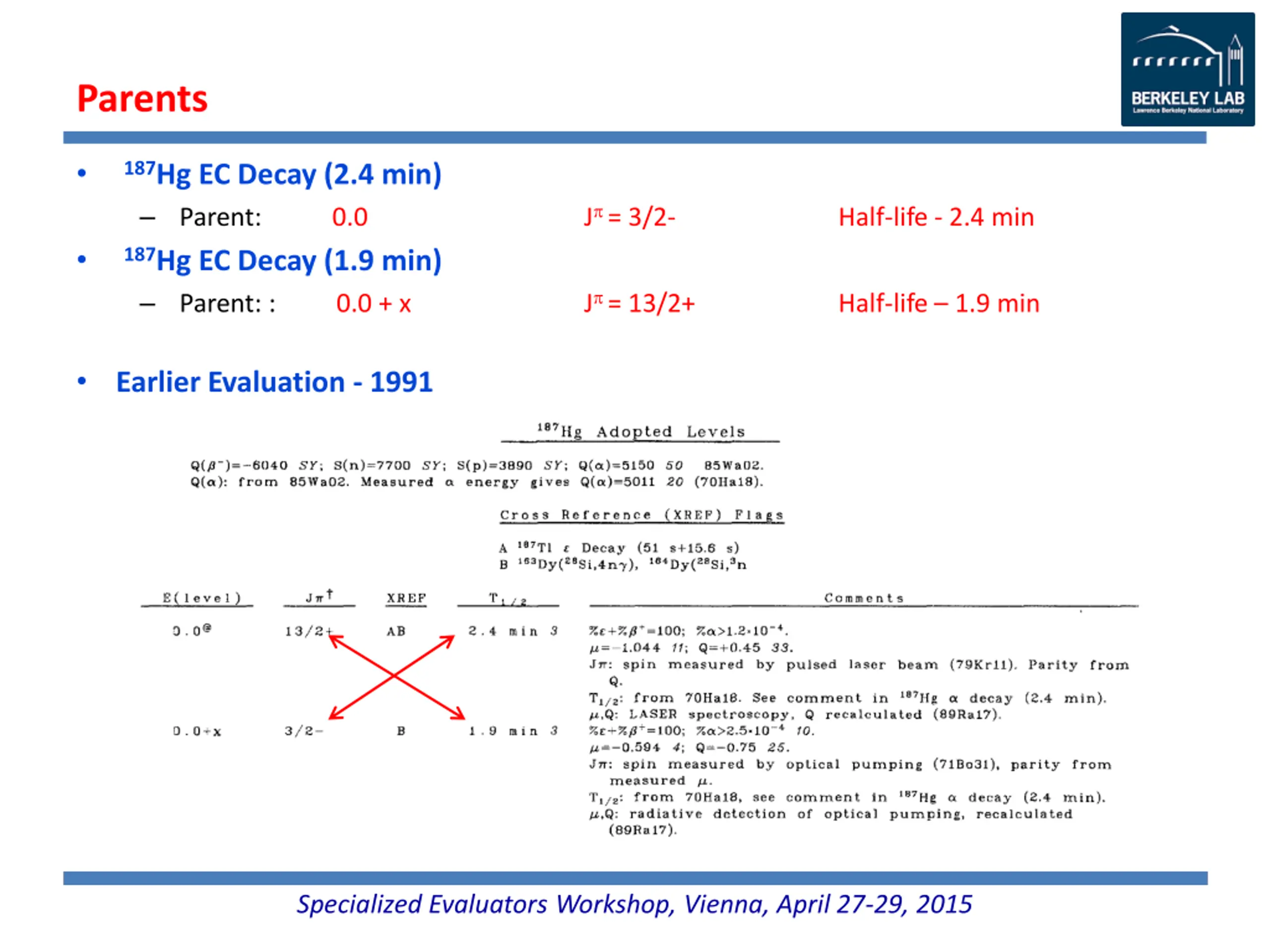 Parents 187Hg EC Decay (2.4 min) Parent: 0.0 J = 3/2- Half-life - 2.4 min 187Hg EC Decay (1.9 min) Parent: : J = 13/2+ 0.0 + x Half-life 1.9 min Earlier Evaluation - 1991 Specialized Evaluators Workshop, Vienna, April 27-29, 2015