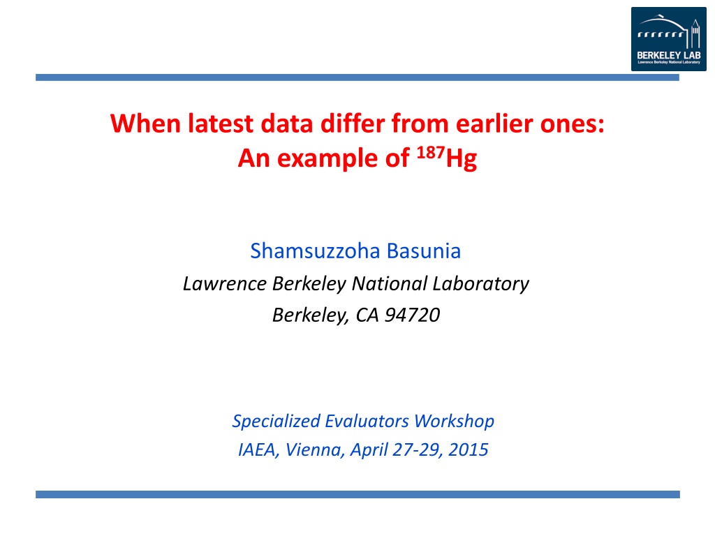 When latest data differ from earlier ones: An example of 187Hg Shamsuzzoha Basunia Lawrence Berkeley National Laboratory Berkeley, CA 94720 Specialized Evaluators Workshop IAEA, Vienna, April 27-29, 2015