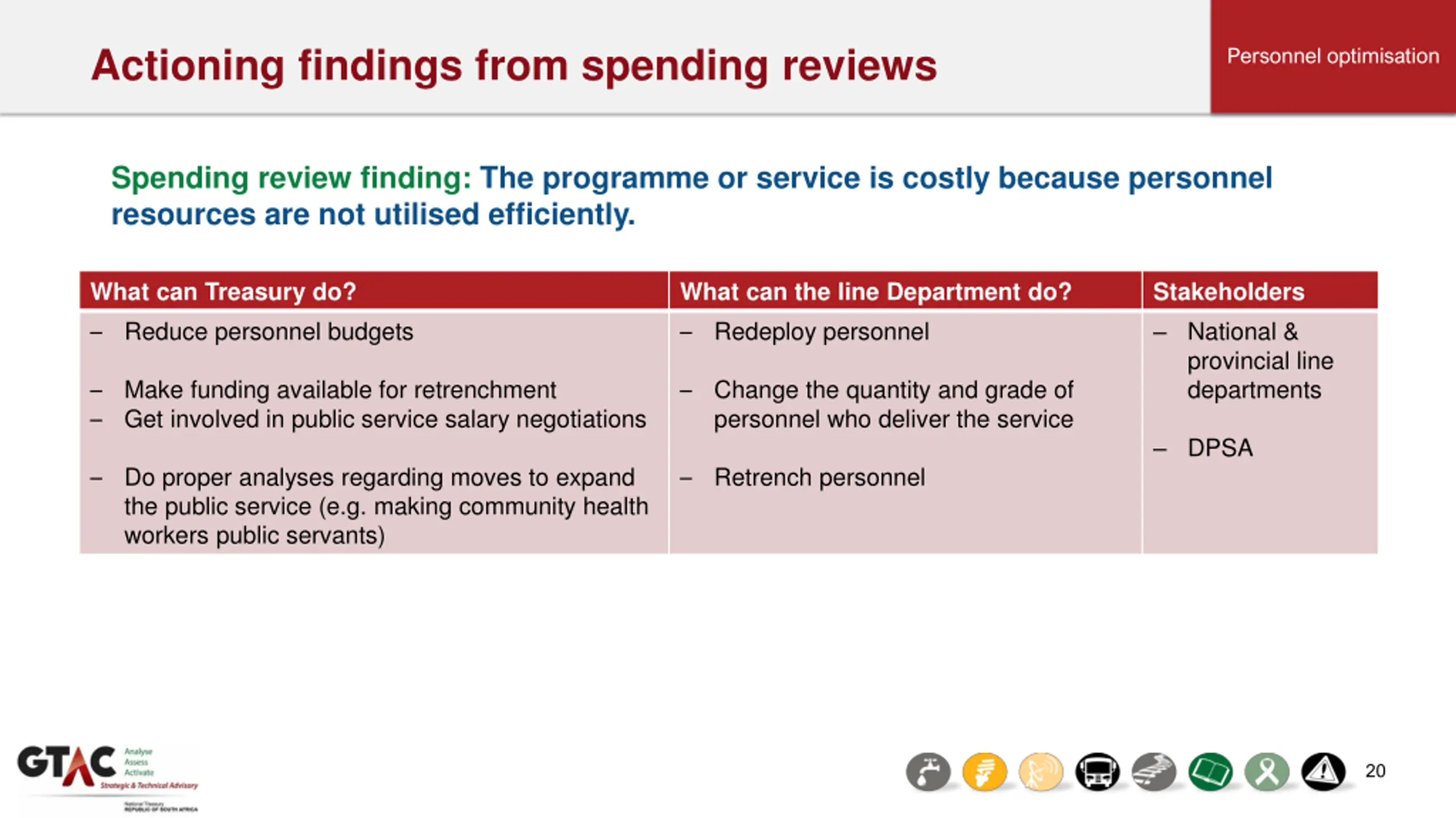Institutional streamlining Actioning findings from spending reviews Personnel optimisation Spending review finding: There is duplication of functions across programmes or entities. What can Treasury do? - Freeze all new positions on programmes where there might be duplication What can the line Department do? Establish a cross-entity task team to map out functions and identify the scale and scope of duplications Stakeholders National & provincial line departments - Get DPSA to review the post establishment of the entity Scale back programme to minimise duplications - Defund the goods and services component of the budget Merge or consolidate entities - Highlight the specific function duplications and require entities to consolidate or eliminate duplication Shut down entities or programmes that duplicate functions 19