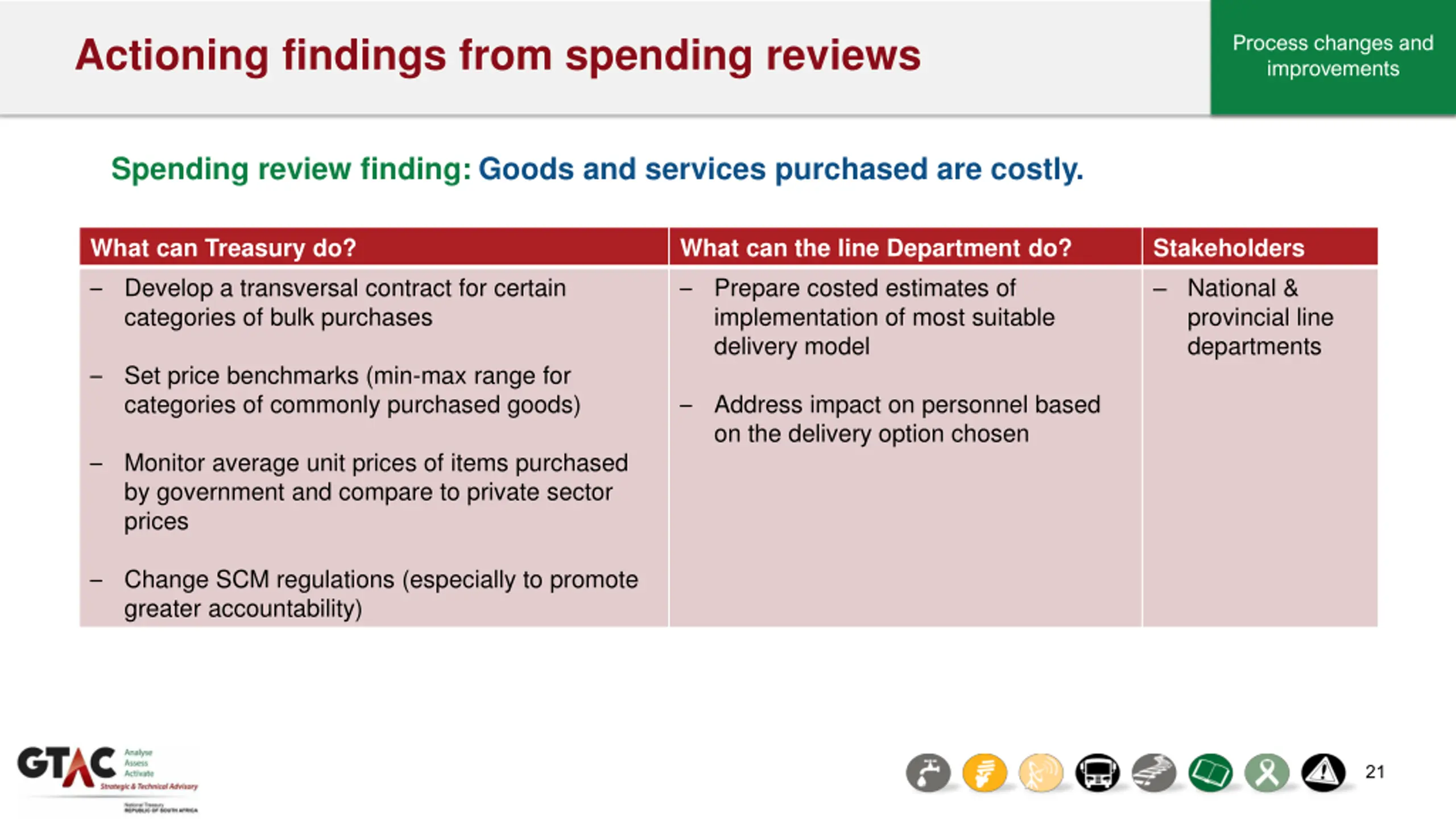 Actioning findings from spending reviews Process changes and improvements Spending review finding:Goods and services purchased are costly. What can Treasury do? Develop a transversal contract for certain categories of bulk purchases What can the line Department do? Prepare costed estimates of implementation of most suitable delivery model Stakeholders National & provincial line departments Set price benchmarks (min-max range for categories of commonly purchased goods) Address impact on personnel based on the delivery option chosen Monitor average unit prices of items purchased by government and compare to private sector prices Change SCM regulations (especially to promote greater accountability) 21