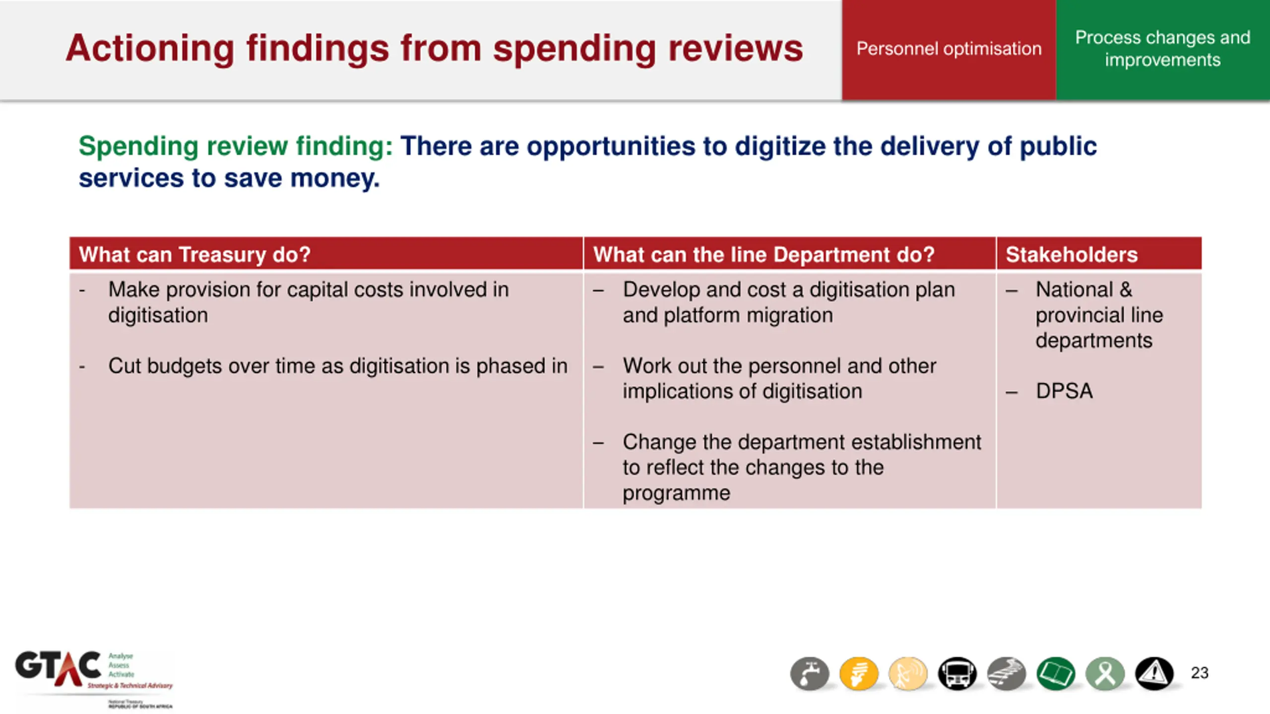 Actioning findings from spending reviews Process changes and improvements Personnel optimisation Spending review finding:There are opportunities to digitize the delivery of public services to save money. What can Treasury do? - Make provision for capital costs involved in digitisation What can the line Department do? Develop and cost a digitisation plan and platform migration Stakeholders National & provincial line departments - Cut budgets over time as digitisation is phased in Work out the personnel and other implications of digitisation DPSA Change the department establishment to reflect the changes to the programme 23