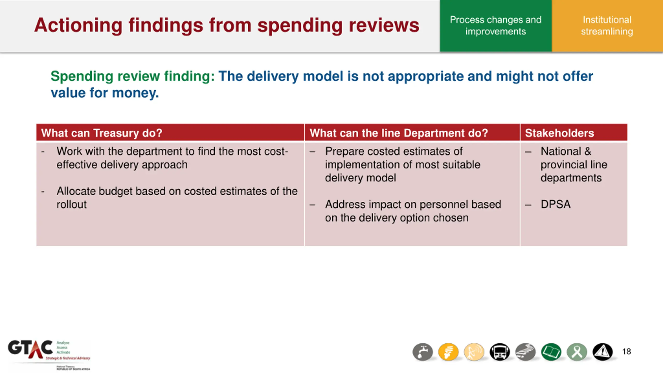 Policy and legislative changes Actioning findings from spending reviews Spending review finding: Government is delivering a service that should be delivered by the private sector. What can Treasury do? - Defund the goods and services component of the programme What can the line Department do? Redeploy personnel Stakeholders National & provincial line departments Retrench personnel - Phase out funding for the programme over time DPSA - Allocate funding for retrenchments - Close the programme 17