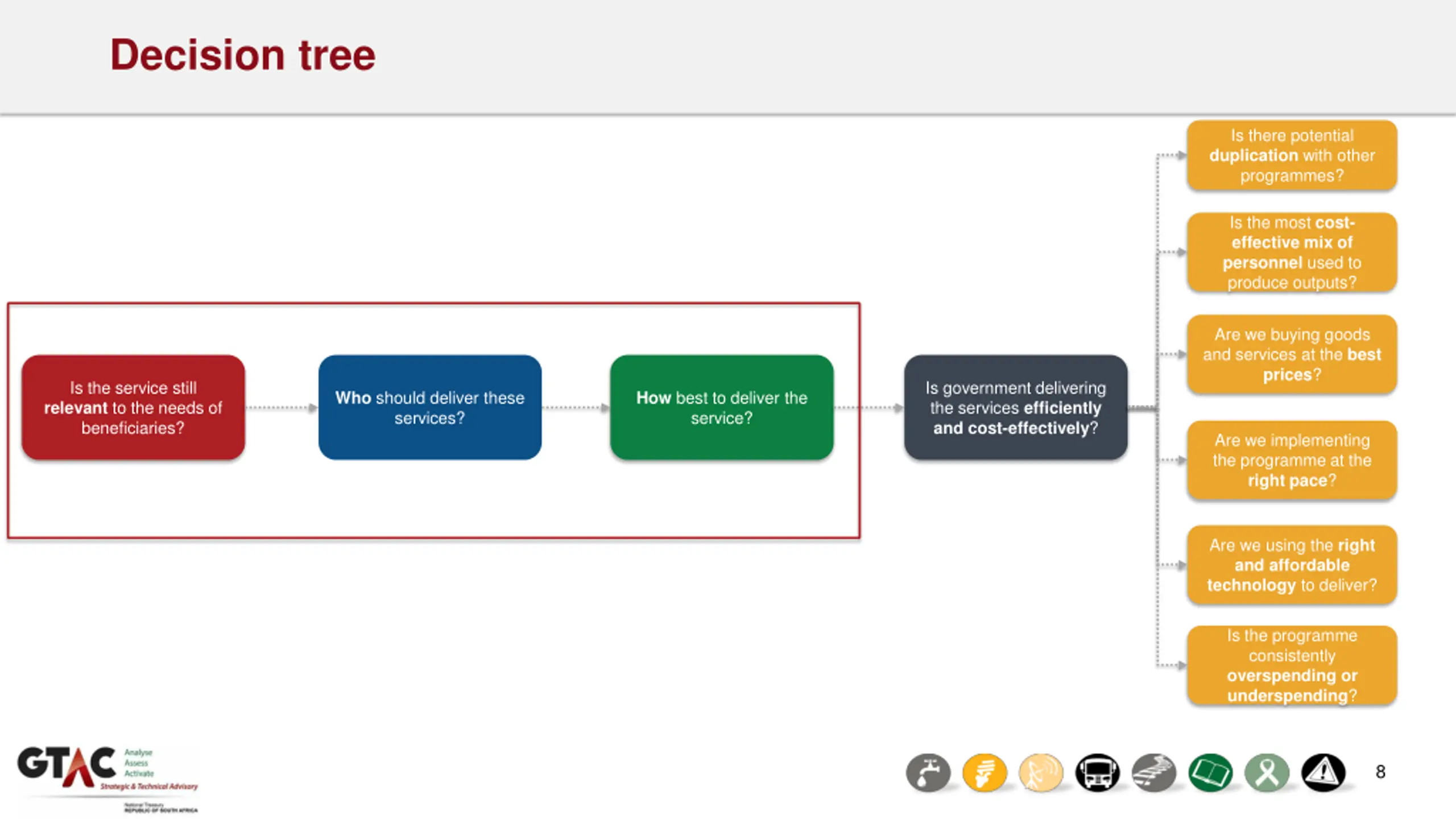 Decision tree Is there potential duplication with other programmes? Is the most cost- effective mix of personnel used to produce outputs? Are we buying goods and services at the best prices? Is the service still relevant to the needs of beneficiaries? Is the service still relevant to the needs of beneficiaries? Is government delivering the services efficiently and cost-effectively? Who should deliver these services? How best to deliver the service? Are we implementing the programme at the right pace? Are we using the right and affordable technology to deliver? Is the programme consistently overspending or underspending? 8