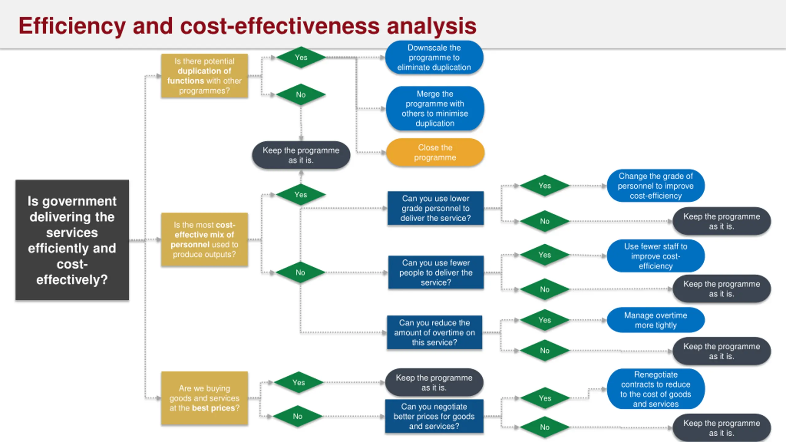 Efficiency and cost-effectiveness analysis Downscale the programme to eliminate duplication Yes Is there potential duplication of functions with other programmes? Merge the programme with others to minimise duplication No Close the programme Keep the programme as it is. Change the grade of personnel to improve cost-efficiency Yes Yes Is government delivering the services efficiently and cost- effectively? Can you use lower grade personnel to deliver the service? Keep the programme as it is. No Is the most cost- effective mix of personnel used to produce outputs? Use fewer staff to improve cost- efficiency Yes Can you use fewer people to deliver the service? No Keep the programme as it is. No Manage overtime more tightly Yes Can you reduce the amount of overtime on this service? Keep the programme as it is. No Renegotiate contracts to reduce to the cost of goods and services Keep the programme as it is. Yes Are we buying goods and services at the best prices? Yes Can you negotiate better prices for goods and services? No Keep the programme as it is. No