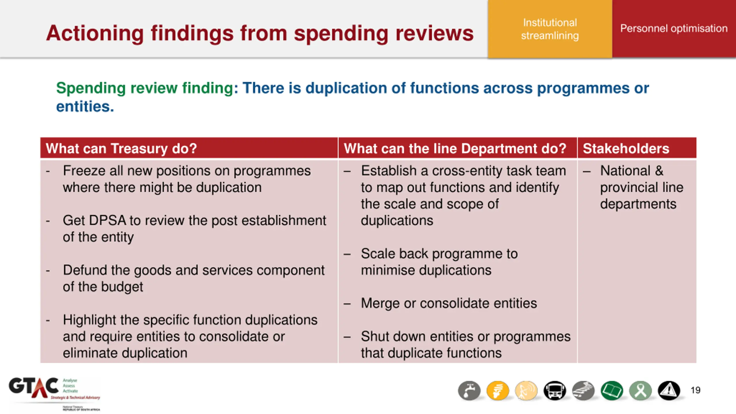 Actioning findings from spending reviews Process changes and improvements Institutional streamlining Spending review finding: The delivery model is not appropriate and might not offer value for money. What can Treasury do? - Work with the department to find the most cost- effective delivery approach What can the line Department do? Prepare costed estimates of implementation of most suitable delivery model Stakeholders National & provincial line departments - Allocate budget based on costed estimates of the rollout Address impact on personnel based on the delivery option chosen DPSA 18