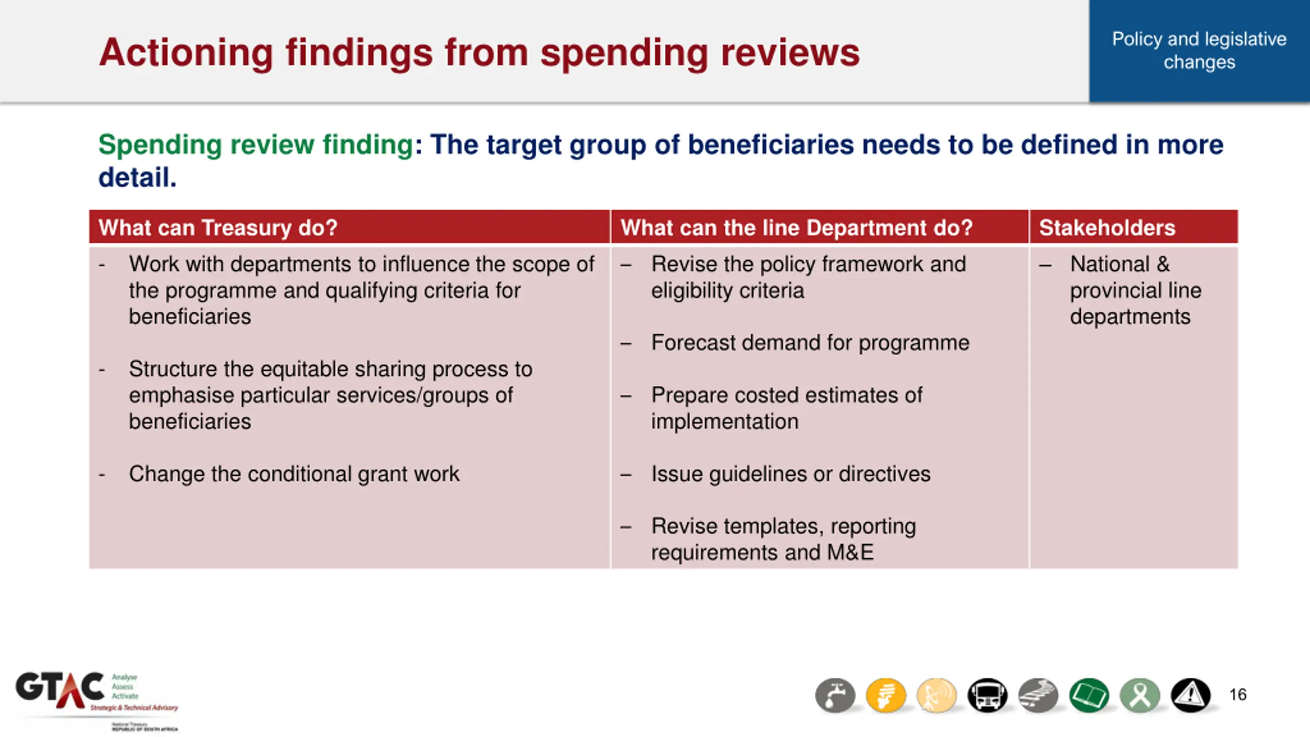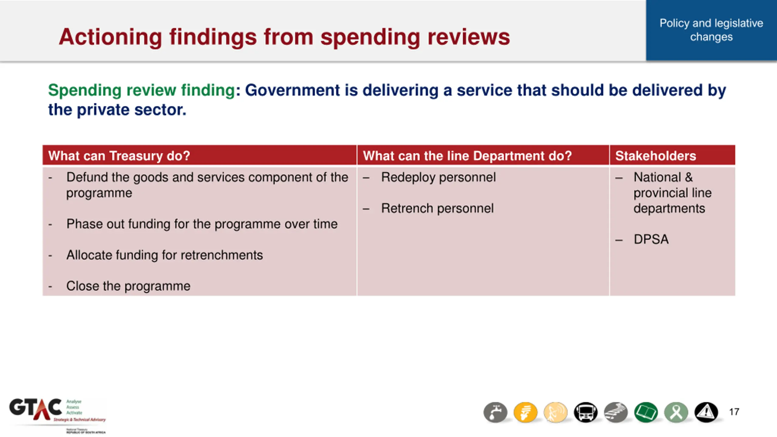 Policy and legislative changes Actioning findings from spending reviews Spending review finding: The target group of beneficiaries needs to be defined in more detail. What can Treasury do? - Work with departments to influence the scope of the programme and qualifying criteria for beneficiaries What can the line Department do? Revise the policy framework and eligibility criteria Stakeholders National & provincial line departments Forecast demand for programme - Structure the equitable sharing process to emphasise particular services/groups of beneficiaries Prepare costed estimates of implementation - Change the conditional grant work Issue guidelines or directives Revise templates, reporting requirements and M&E 16