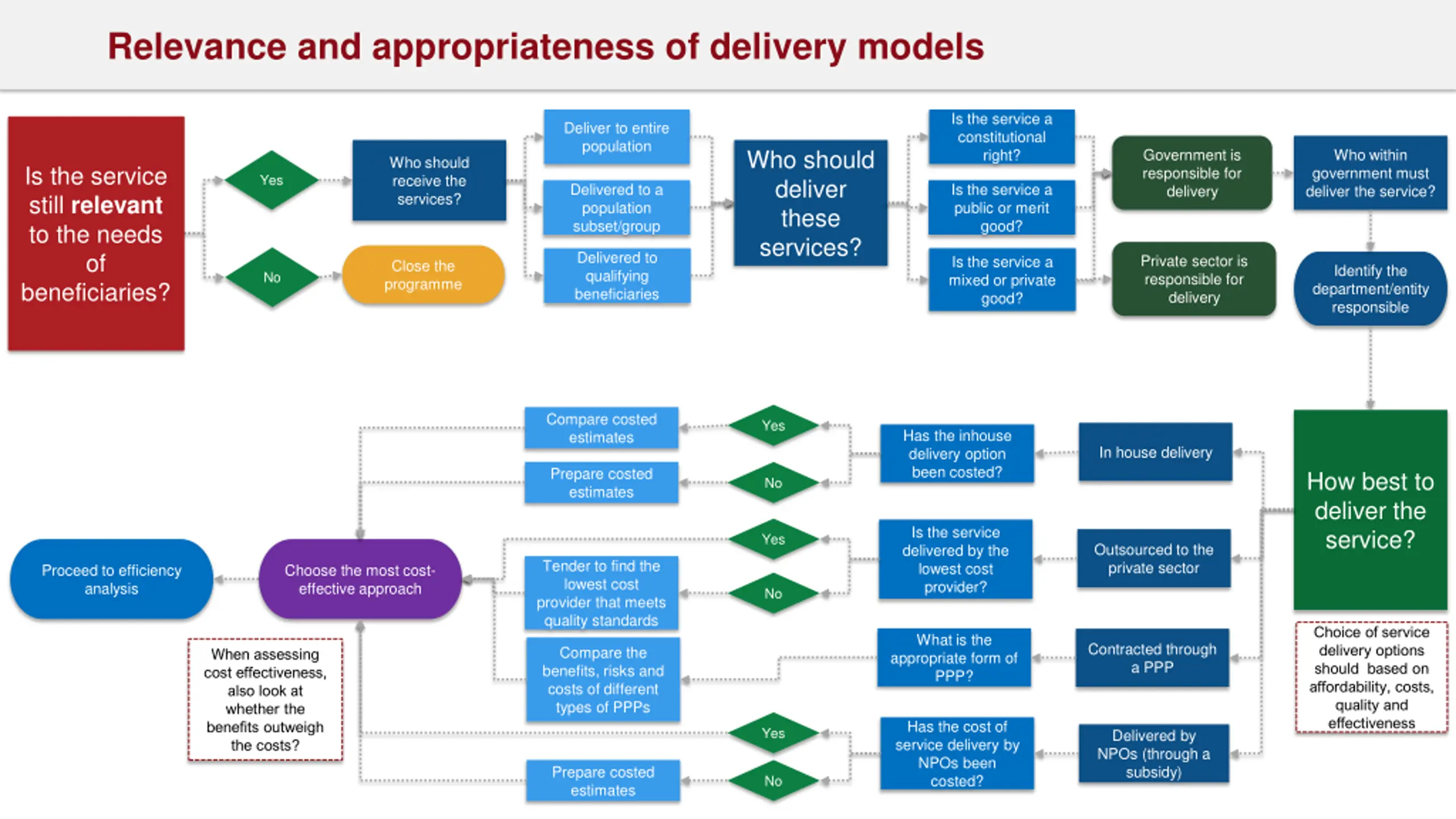 Relevance and appropriateness of delivery models Is the service a constitutional right? Deliver to entire population Who should deliver these services? Government is responsible for delivery Who within government must deliver the service? Who should receive the services? Is the service still relevant to the needs of beneficiaries? Yes Is the service a public or merit good? Delivered to a population subset/group Delivered to qualifying beneficiaries Private sector is responsible for delivery Is the service a mixed or private good? Close the programme Identify the department/entity responsible No Compare costed estimates Yes Has the inhouse delivery option been costed? In house delivery Prepare costed estimates How best to deliver the service? No Is the service delivered by the lowest cost provider? Yes Proceed to efficiency analysis Outsourced to the private sector Tender to find the lowest cost provider that meets quality standards Proceed to efficiency analysis Choose the most cost- effective approach No Choice of service delivery options should based on affordability, costs, quality and effectiveness What is the appropriate form of PPP? Contracted through a PPP Compare the benefits, risks and costs of different types of PPPs When assessing cost effectiveness, also look at whether the benefits outweigh the costs? Has the cost of service delivery by NPOs been costed? Yes Delivered by NPOs (through a subsidy) Prepare costed estimates No