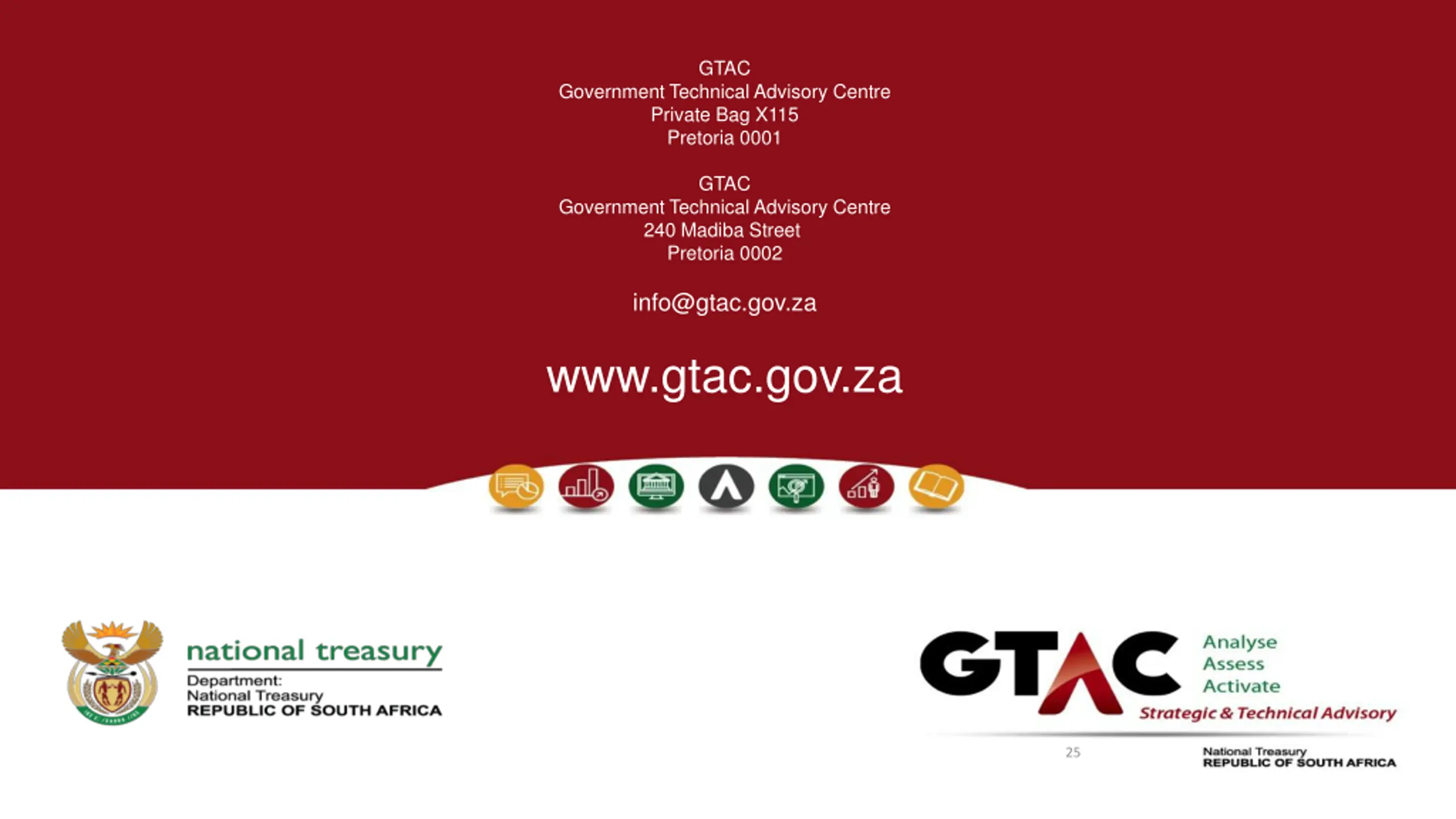 GTAC Government Technical Advisory Centre Private Bag X115 Pretoria 0001 GTAC Government Technical Advisory Centre 240 Madiba Street Pretoria 0002 info@gtac.gov.za www.gtac.gov.za 25