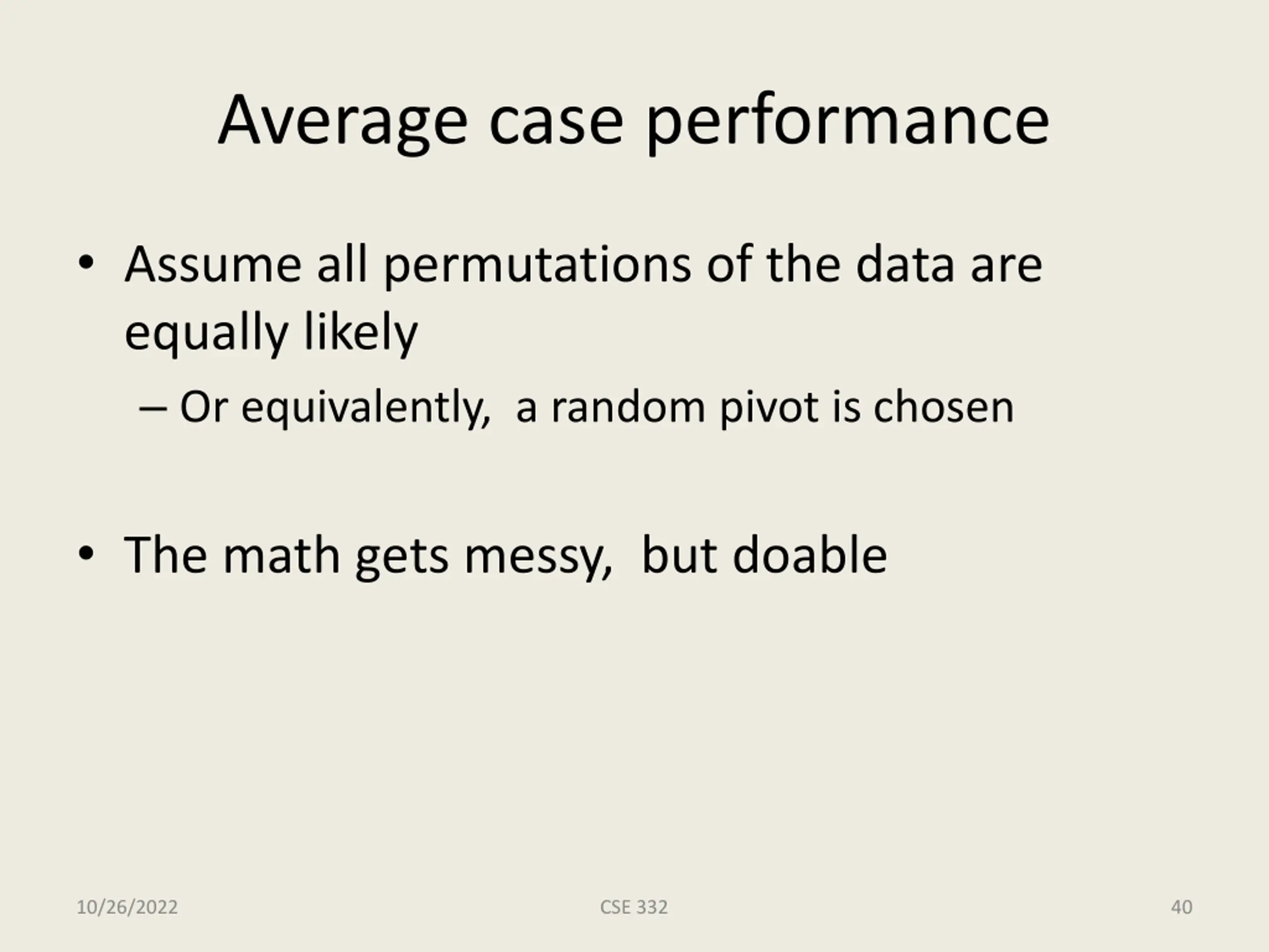 Average case performance Assume all permutations of the data are equally likely Or equivalently, a random pivot is chosen The math gets messy, but doable 10/26/2022 CSE 332 40