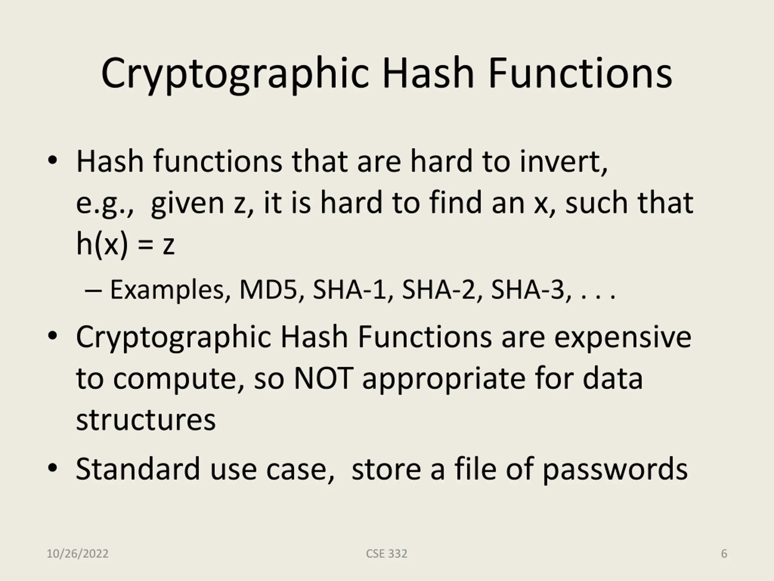 Cryptographic Hash Functions Hash functions that are hard to invert, e.g., given z, it is hard to find an x, such that h(x) = z Examples, MD5, SHA-1, SHA-2, SHA-3, . . . Cryptographic Hash Functions are expensive to compute, so NOT appropriate for data structures Standard use case, store a file of passwords 10/26/2022 CSE 332 6