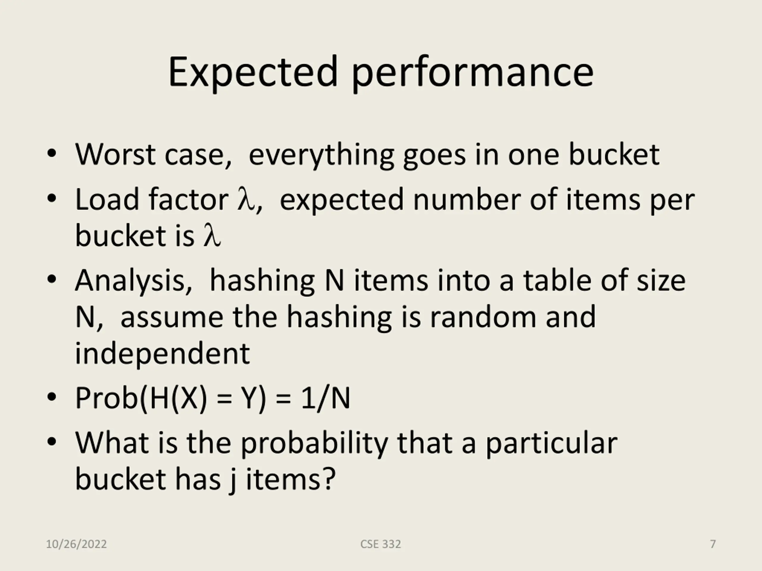 Expected performance Worst case, everything goes in one bucket Load factor , expected number of items per bucket is Analysis, hashing N items into a table of size N, assume the hashing is random and independent Prob(H(X) = Y) = 1/N What is the probability that a particular bucket has j items? 10/26/2022 CSE 332 7