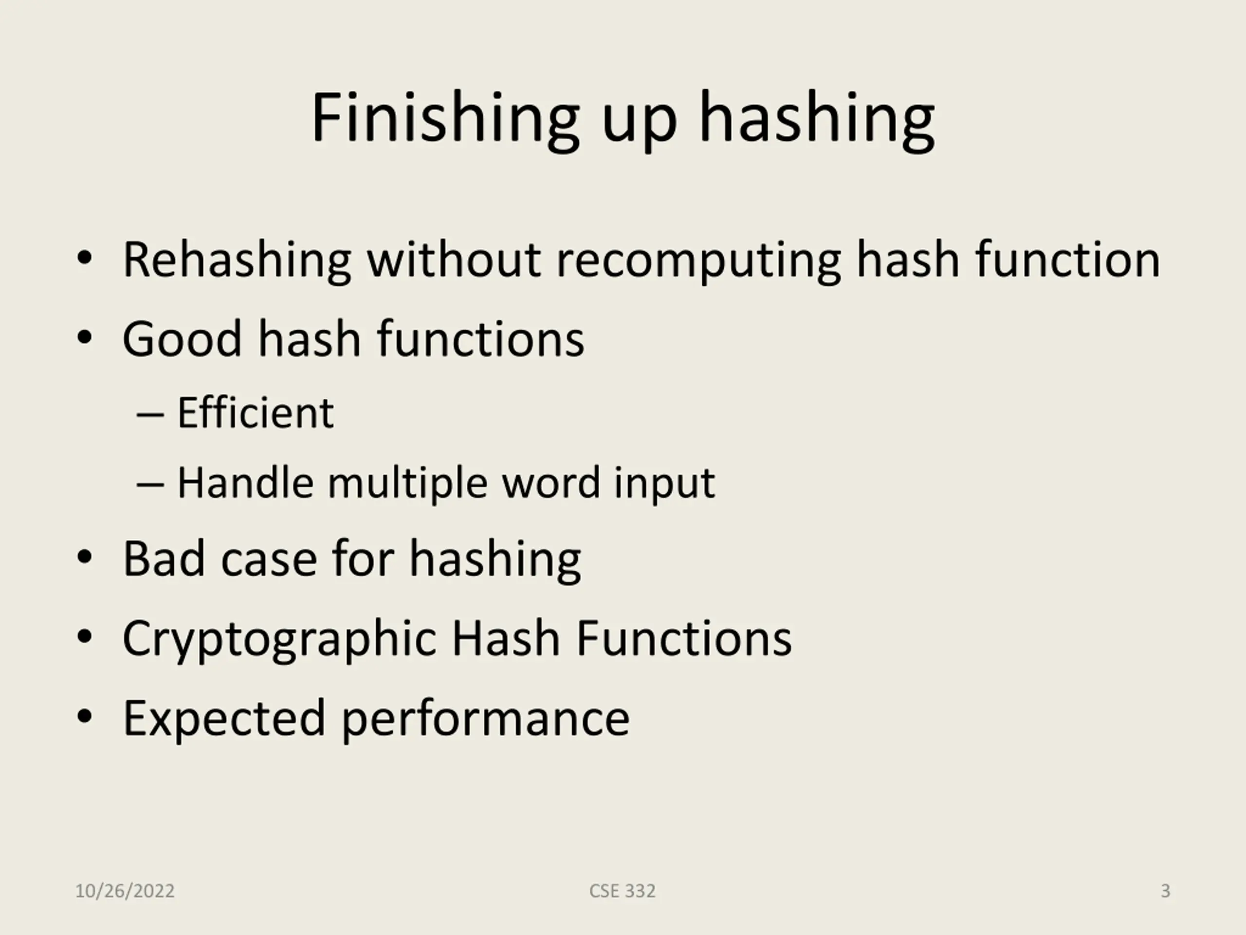 Finishing up hashing Rehashing without recomputing hash function Good hash functions Efficient Handle multiple word input Bad case for hashing Cryptographic Hash Functions Expected performance 10/26/2022 CSE 332 3