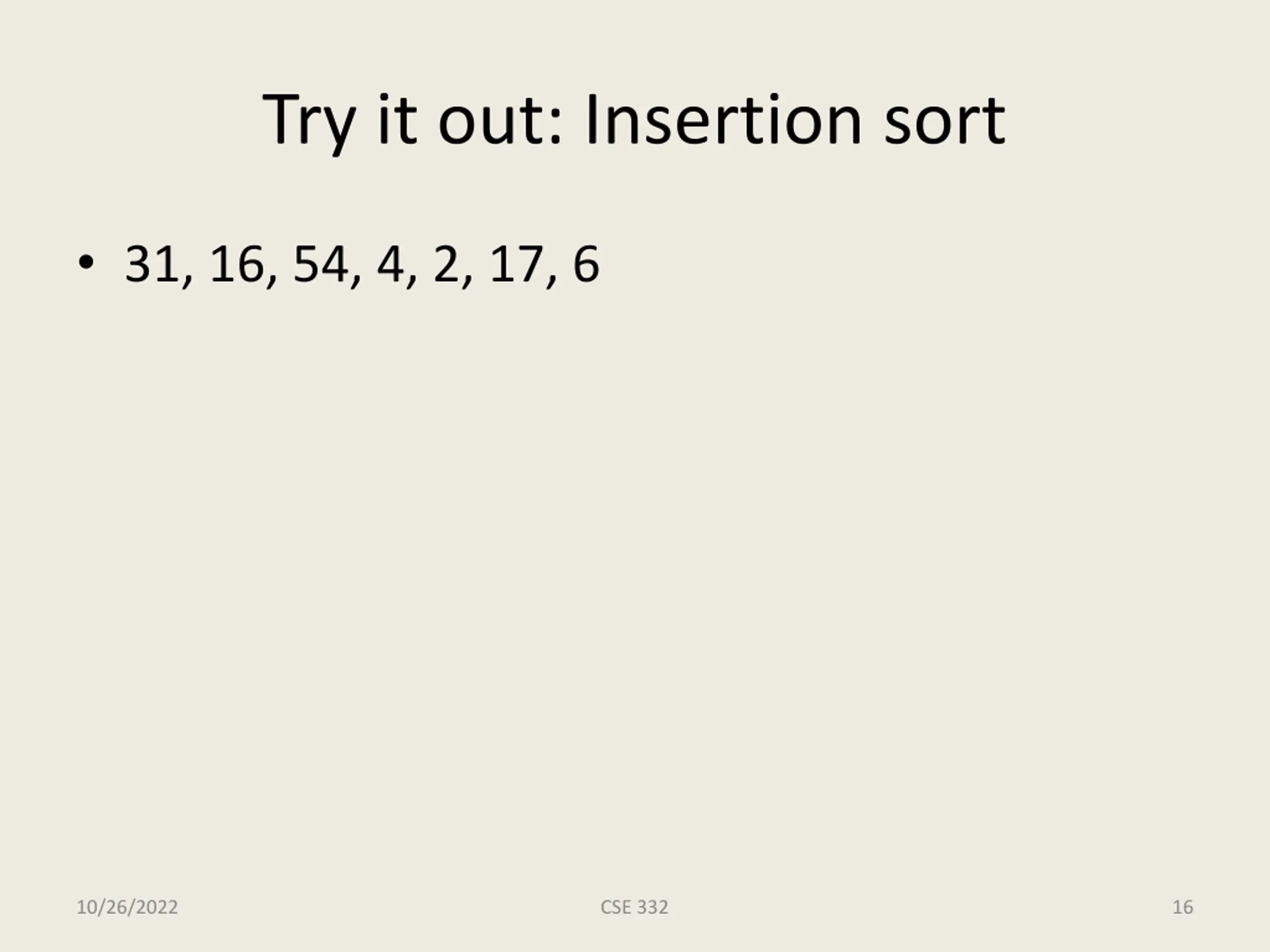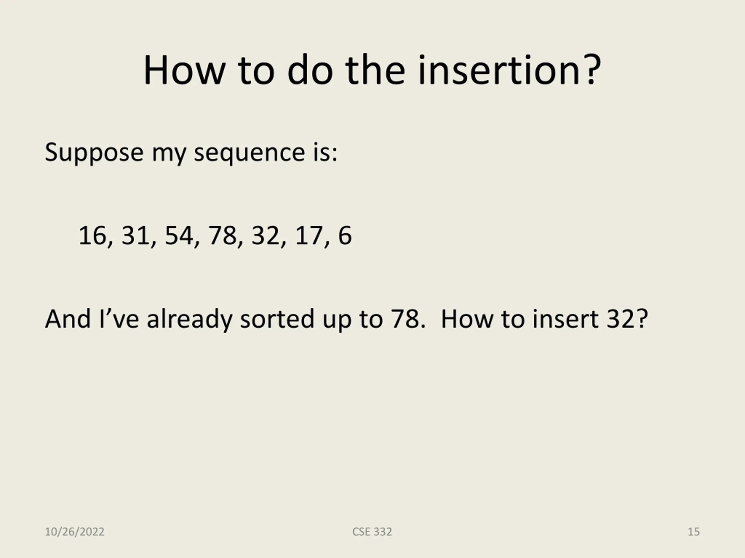How to do the insertion? Suppose my sequence is: 16, 31, 54, 78, 32, 17, 6 And I ve already sorted up to 78. How to insert 32? 10/26/2022 CSE 332 15