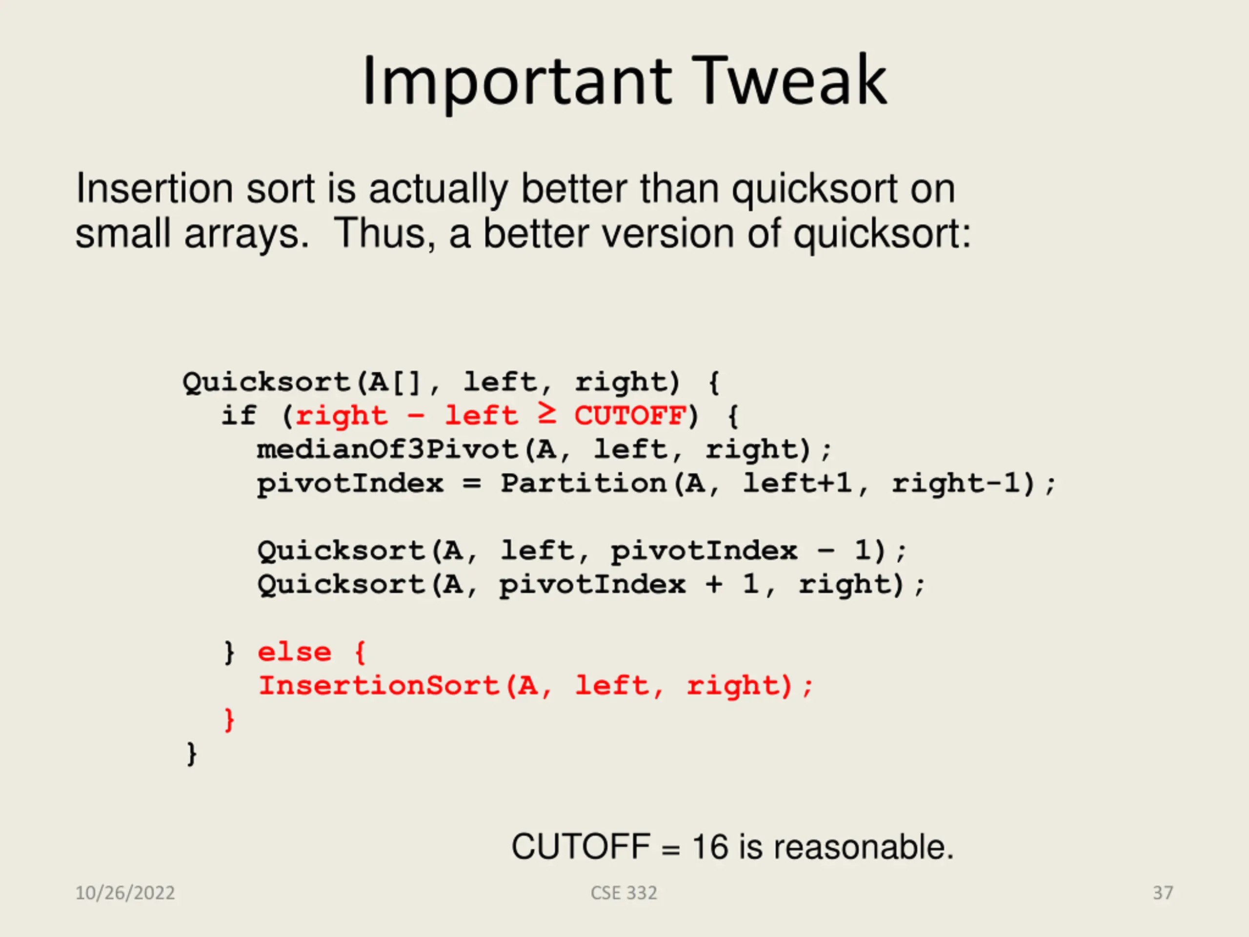Important Tweak Insertion sort is actually better than quicksort on small arrays. Thus, a better version of quicksort: Quicksort(A[], left, right) { if (right left CUTOFF) { medianOf3Pivot(A, left, right); pivotIndex = Partition(A, left+1, right-1); Quicksort(A, left, pivotIndex 1); Quicksort(A, pivotIndex + 1, right); } else { InsertionSort(A, left, right); } } CUTOFF = 16 is reasonable. 10/26/2022 CSE 332 37
