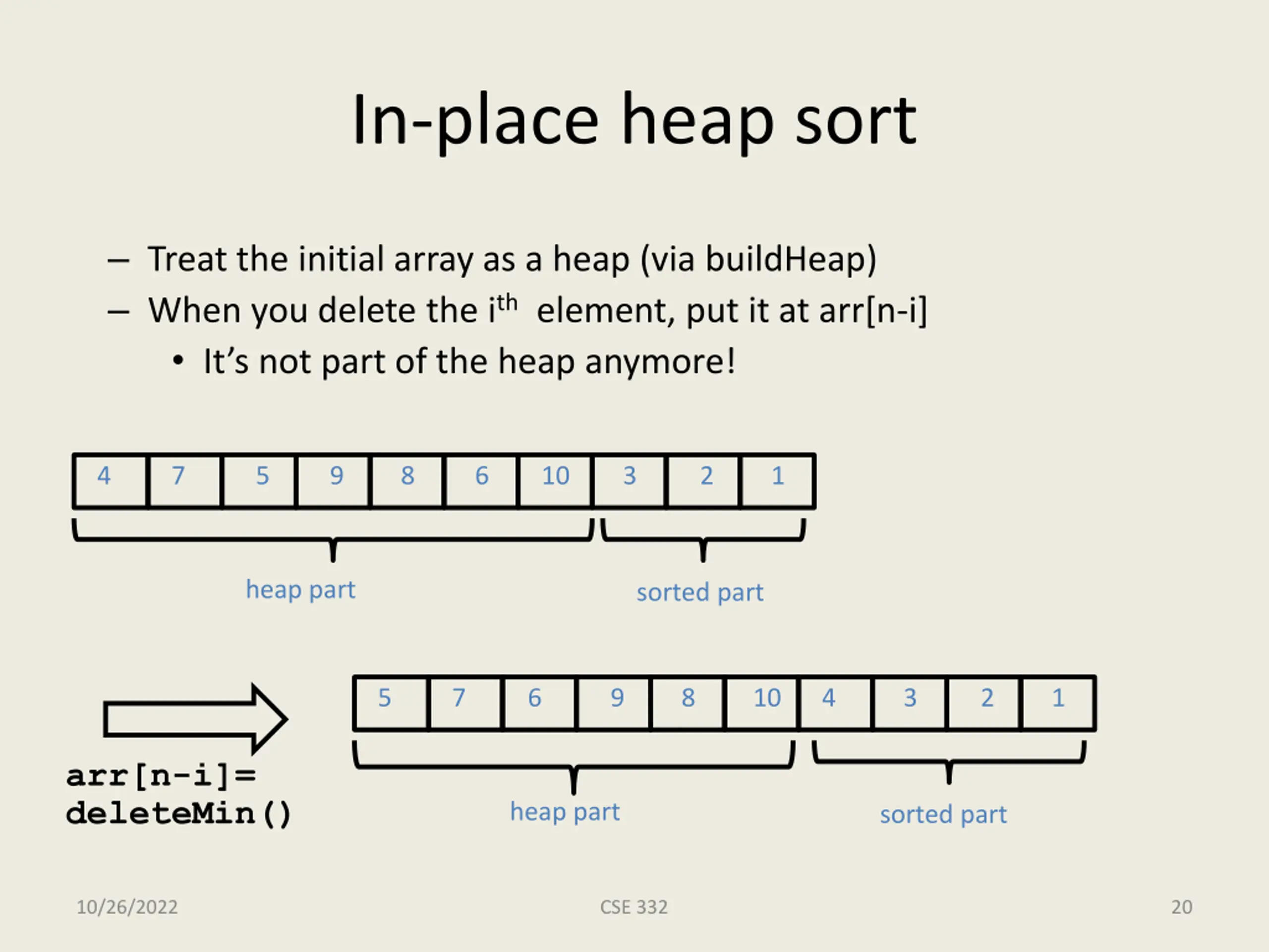 In-place heap sort Treat the initial array as a heap (via buildHeap) When you delete the ith element, put it at arr[n-i] It s not part of the heap anymore! 4 7 5 9 8 6 10 3 2 1 heap part sorted part 5 7 6 9 8 10 4 3 2 1 arr[n-i]= deleteMin() heap part sorted part 10/26/2022 CSE 332 20