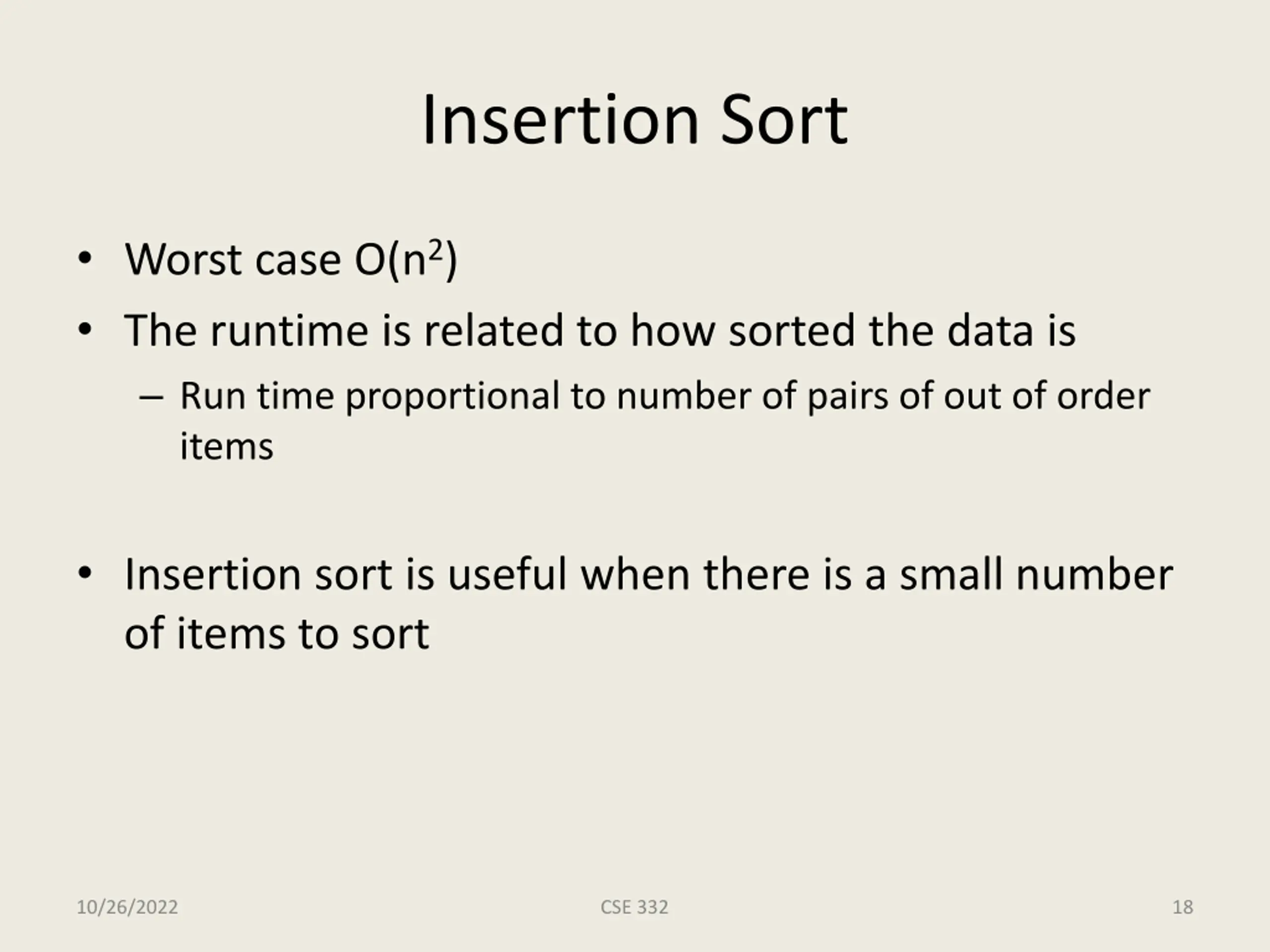 Insertion Sort Worst case O(n2) The runtime is related to how sorted the data is Run time proportional to number of pairs of out of order items Insertion sort is useful when there is a small number of items to sort 10/26/2022 CSE 332 18