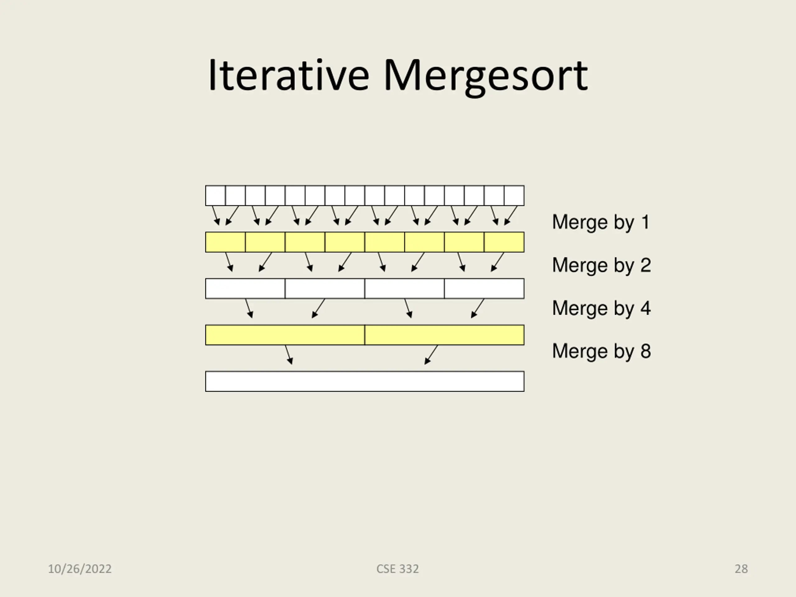 Iterative Mergesort Merge by 1 Merge by 2 Merge by 4 Merge by 8 10/26/2022 CSE 332 28