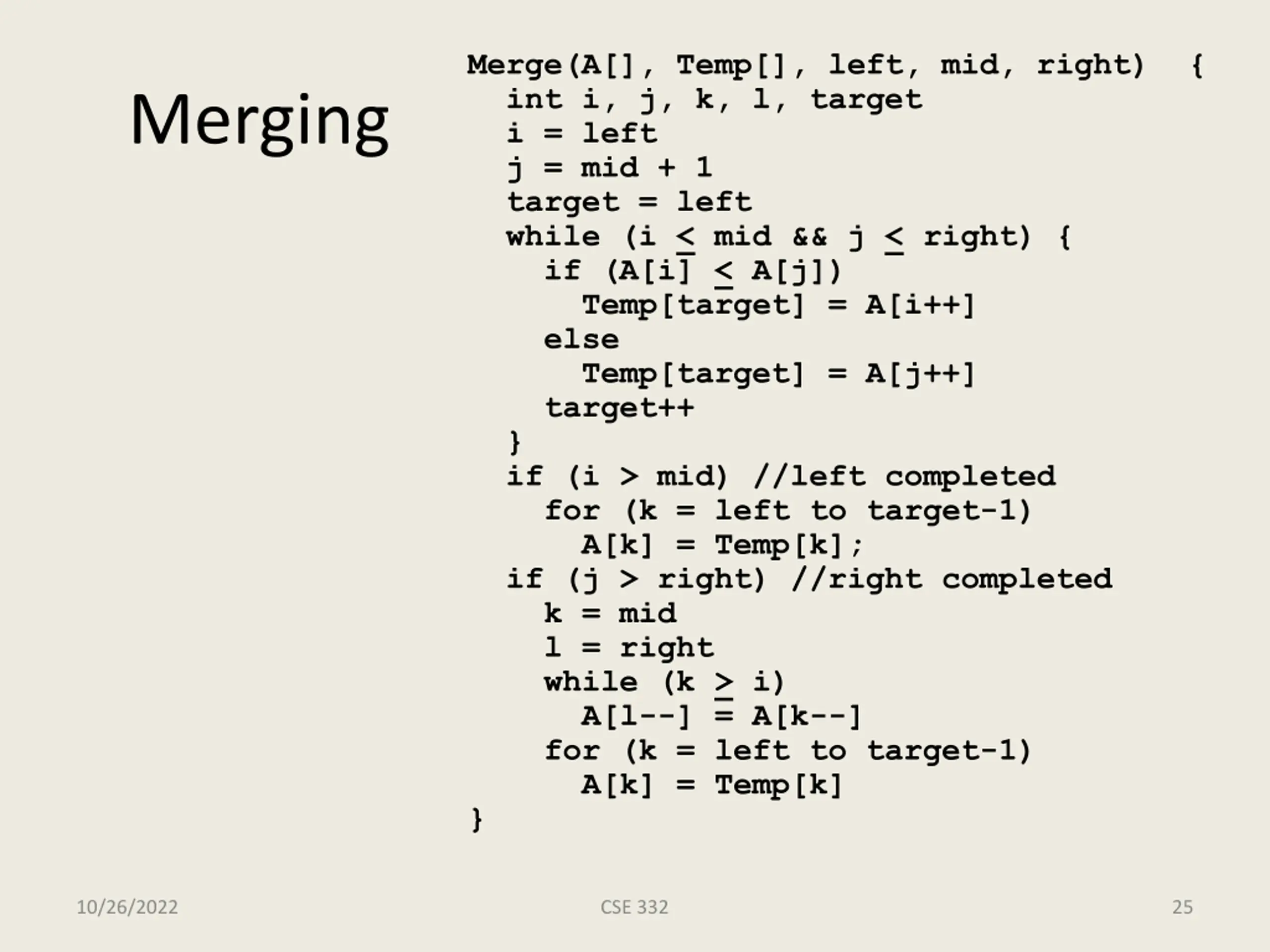 Merge(A[], Temp[], left, mid, right) { int i, j, k, l, target i = left j = mid + 1 target = left while (i < mid && j < right) { if (A[i] < A[j]) Temp[target] = A[i++] else Temp[target] = A[j++] target++ } if (i > mid) //left completed for (k = left to target-1) A[k] = Temp[k]; if (j > right) //right completed k = mid l = right while (k > i) A[l--] = A[k--] for (k = left to target-1) A[k] = Temp[k] } Merging 10/26/2022 CSE 332 25