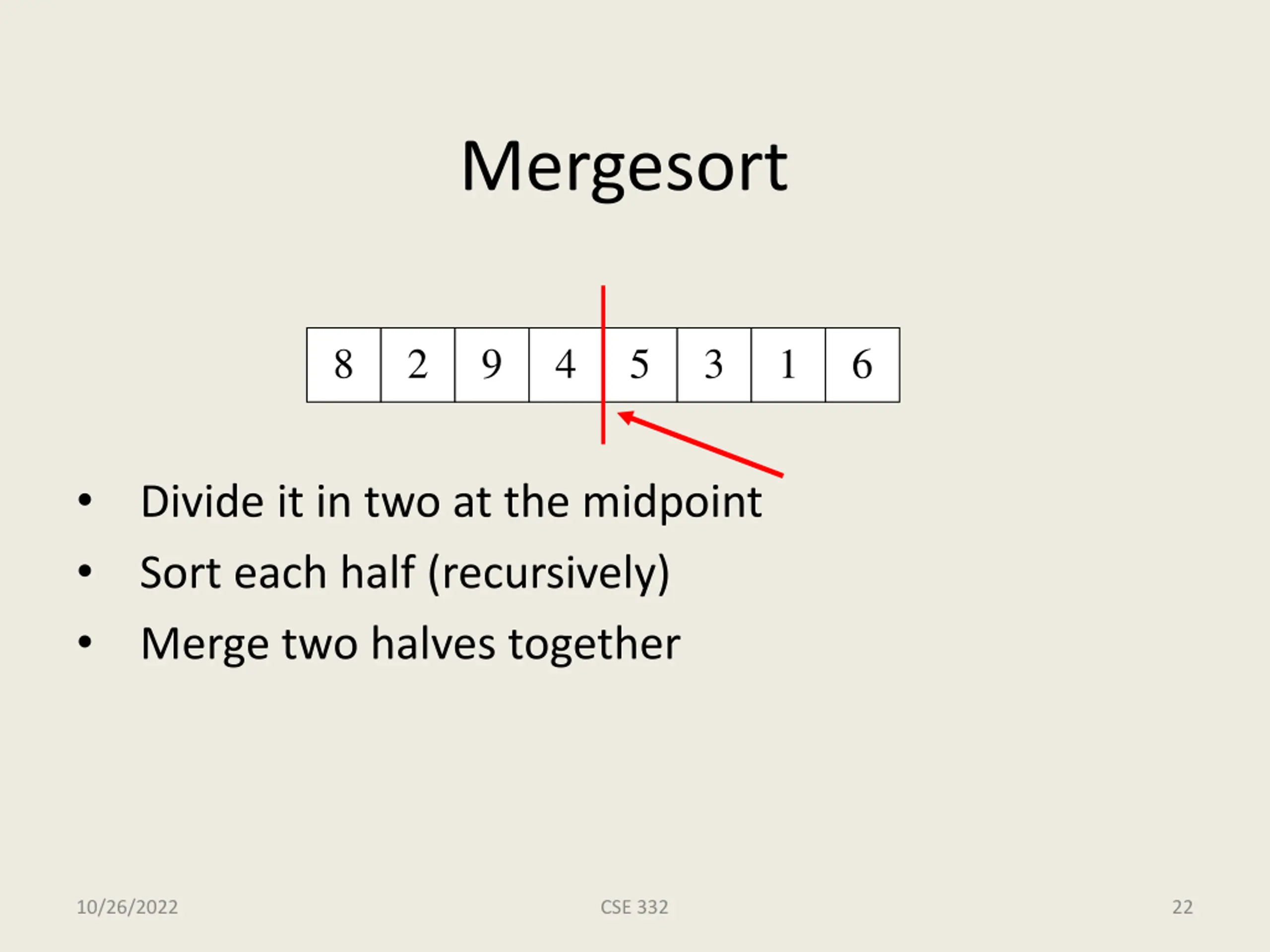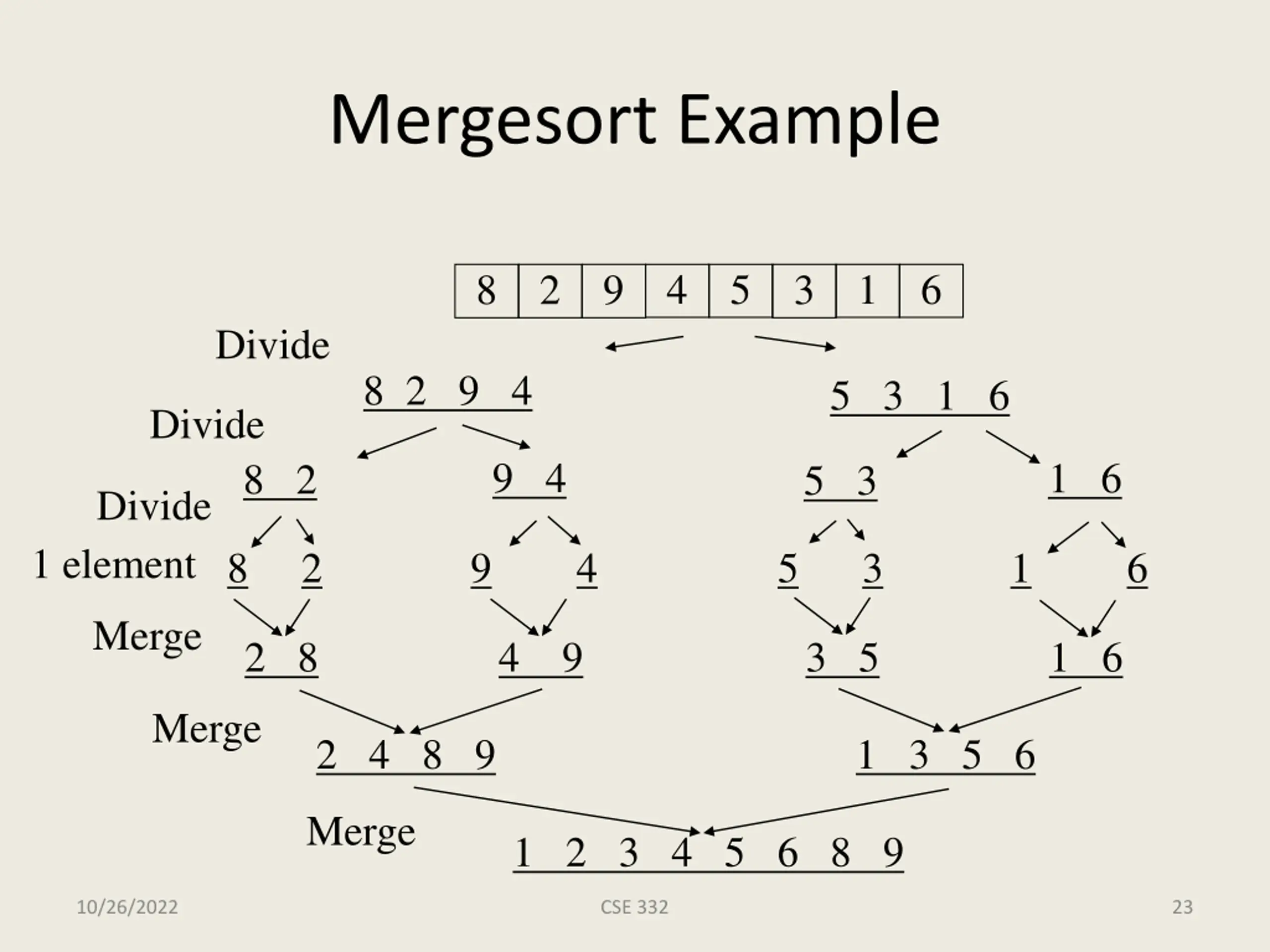 Mergesort 8 2 9 4 5 3 1 6 Divide it in two at the midpoint Sort each half (recursively) Merge two halves together 10/26/2022 CSE 332 22